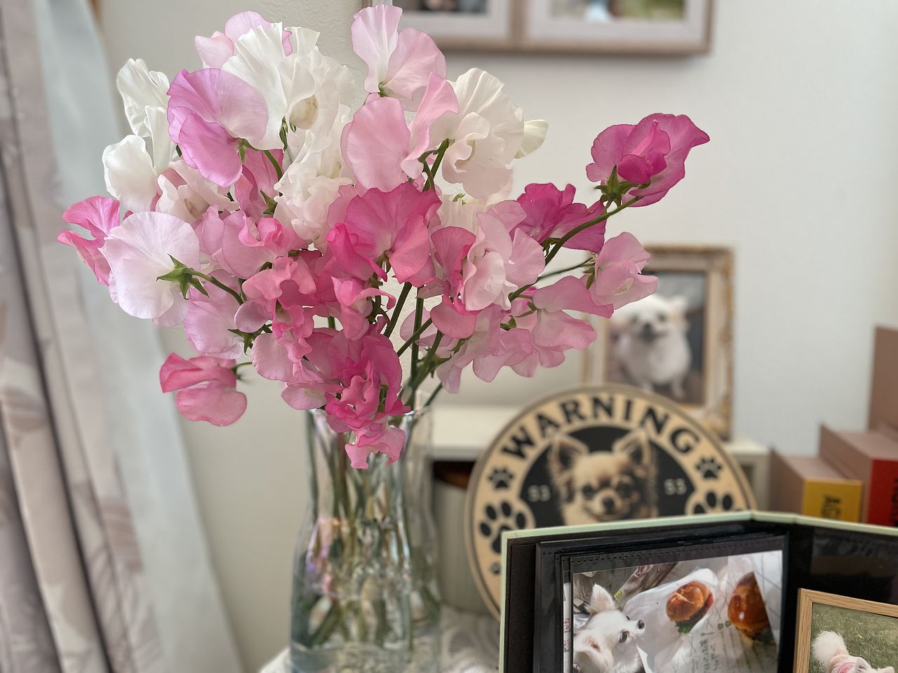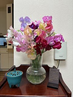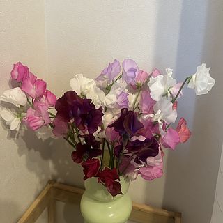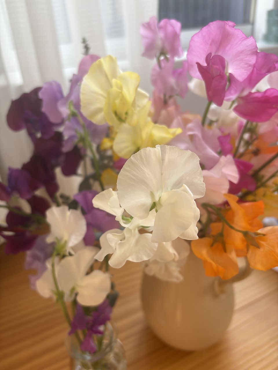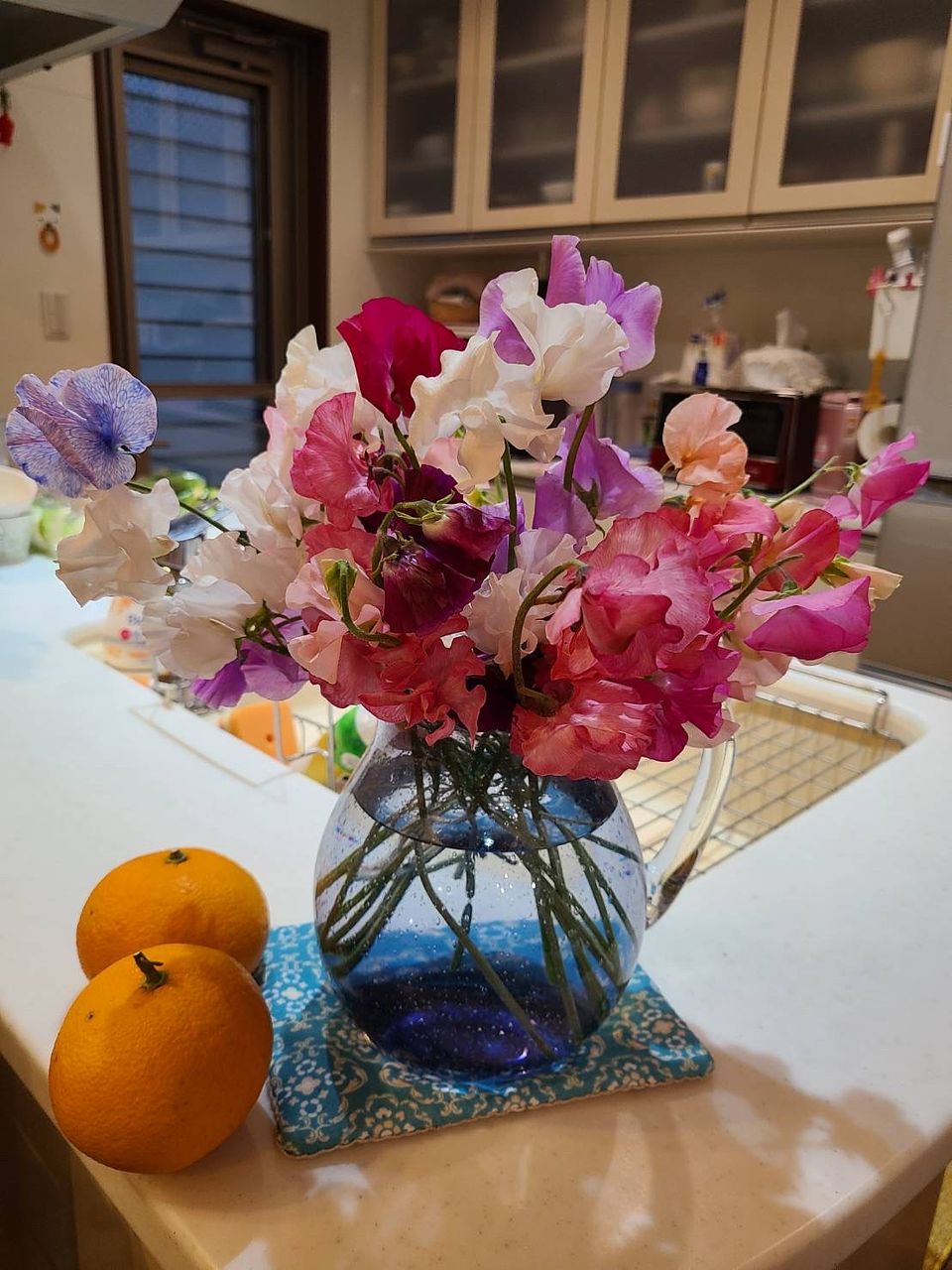 カラフルでかわいいスイートピーでした。 長い茎と短い茎の花が混じってましたが、別々に生けて2種類楽しめました。 玄関がいい香りで満たされてます。