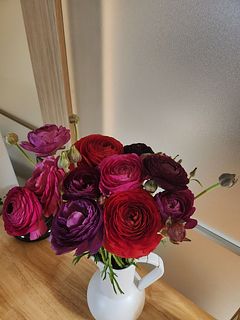 いつも、淡い色の花を選んでしまうのですが、今回は、玄関がパッと明るくなるような、仕事に行く時、帰ってきた時に元気が出るように、赤い色の花を選びました。華やかな、ラナンキュラスに元気をもらっています😊