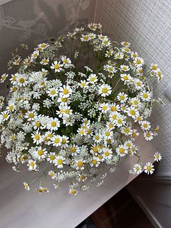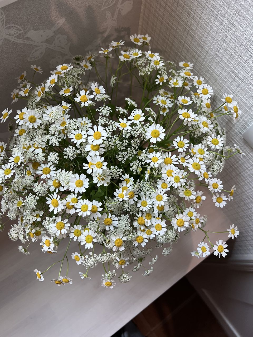 ふわふわゆれるマトリカリア「シングルペグモ」と「ホワイトレースフラワー」をたっぷり束ねました💐