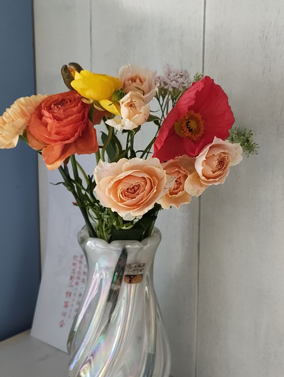 届いた時はバラがつぼみの状態だったのですが水揚げして花瓶に飾って一晩経ったら丁度いい状態に! 元々飾ってた花とあわせてめちゃくちゃかわいくなりました。 一本だけ赤いポピーが混ざってたのですがそれは別の花瓶に飾りました。
