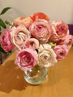 箱を開けた瞬間、きっと「かわいすぎる!」と声が漏れてしまうかも?ぽっと頬を染めたようなピンク系のおしゃれなラナンキュラスを束ねました🩰