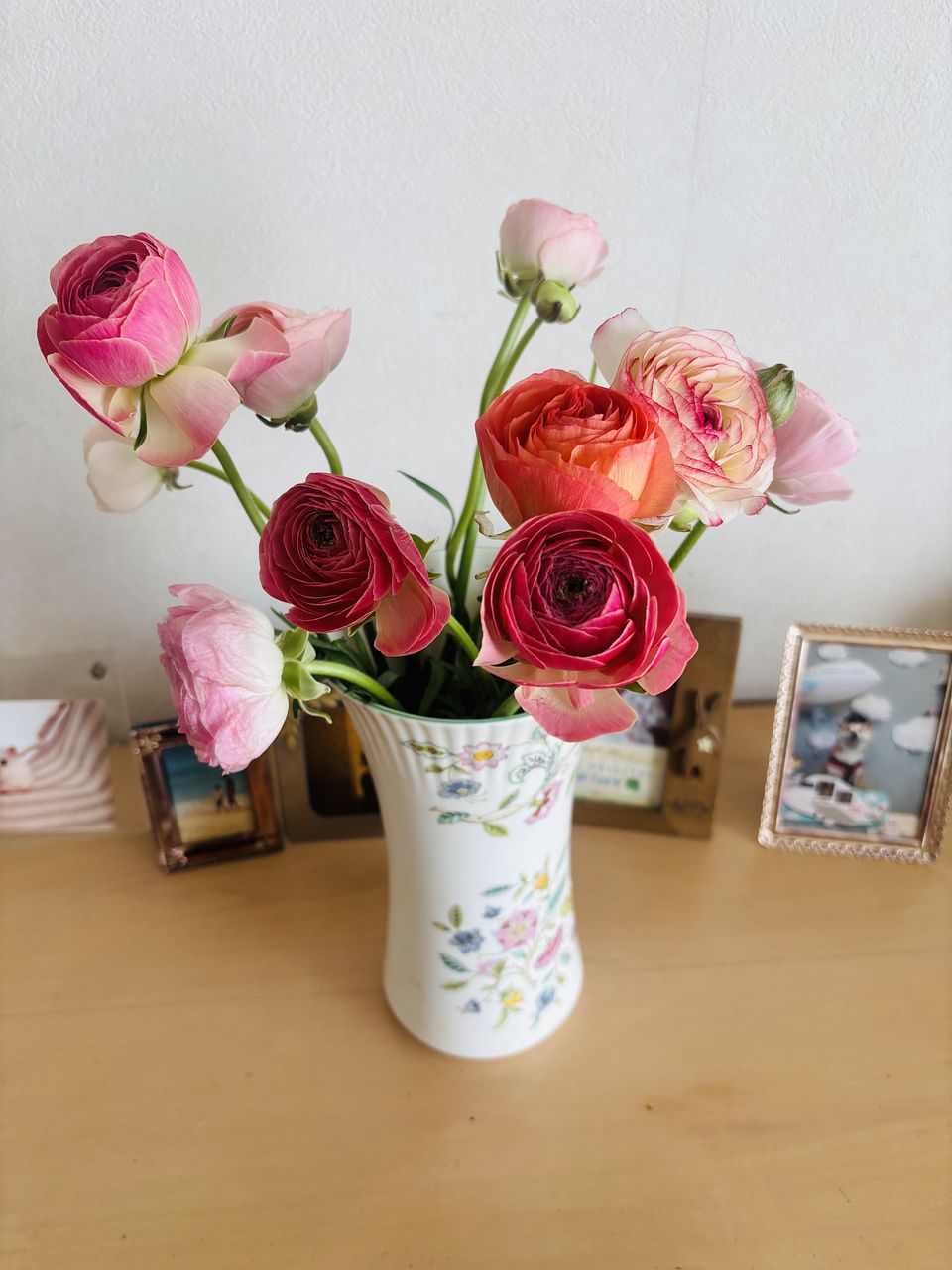 可愛いお色のラナンキュラス🩷 大好きなお花の1つです💕 前回購入の桜が満開で並べて飾っています🌸 長く楽しめるようにお手入れ頑張ります😊