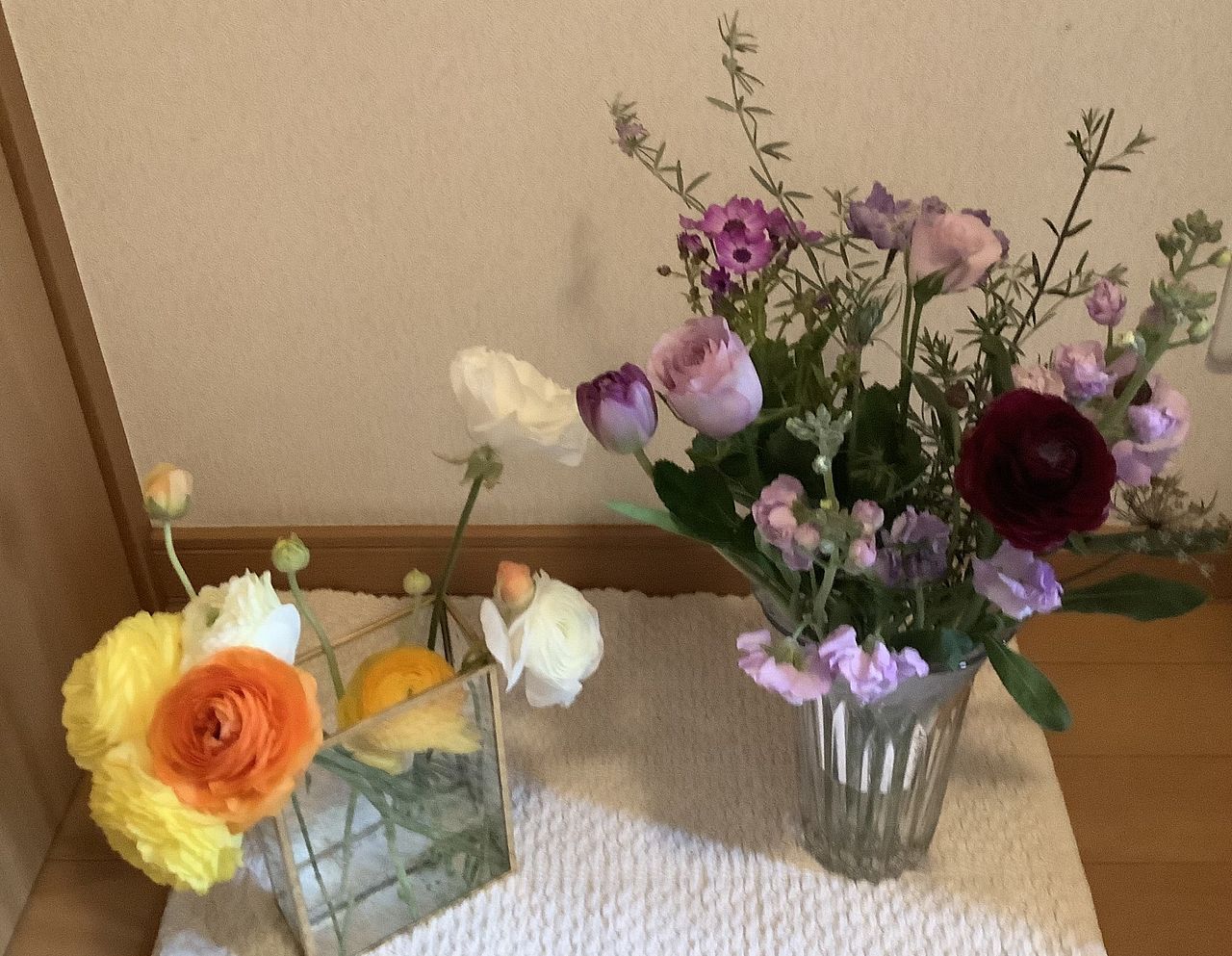 たっぷりなお花が届きました🌸 祖母の好きな紫で、とてもきれいです 嬉しいことに、いつもの花瓶には収まらず、2つに分けて飾っています✨ 個人的には、紫のチューリップ🌷の色がとても好きです💕