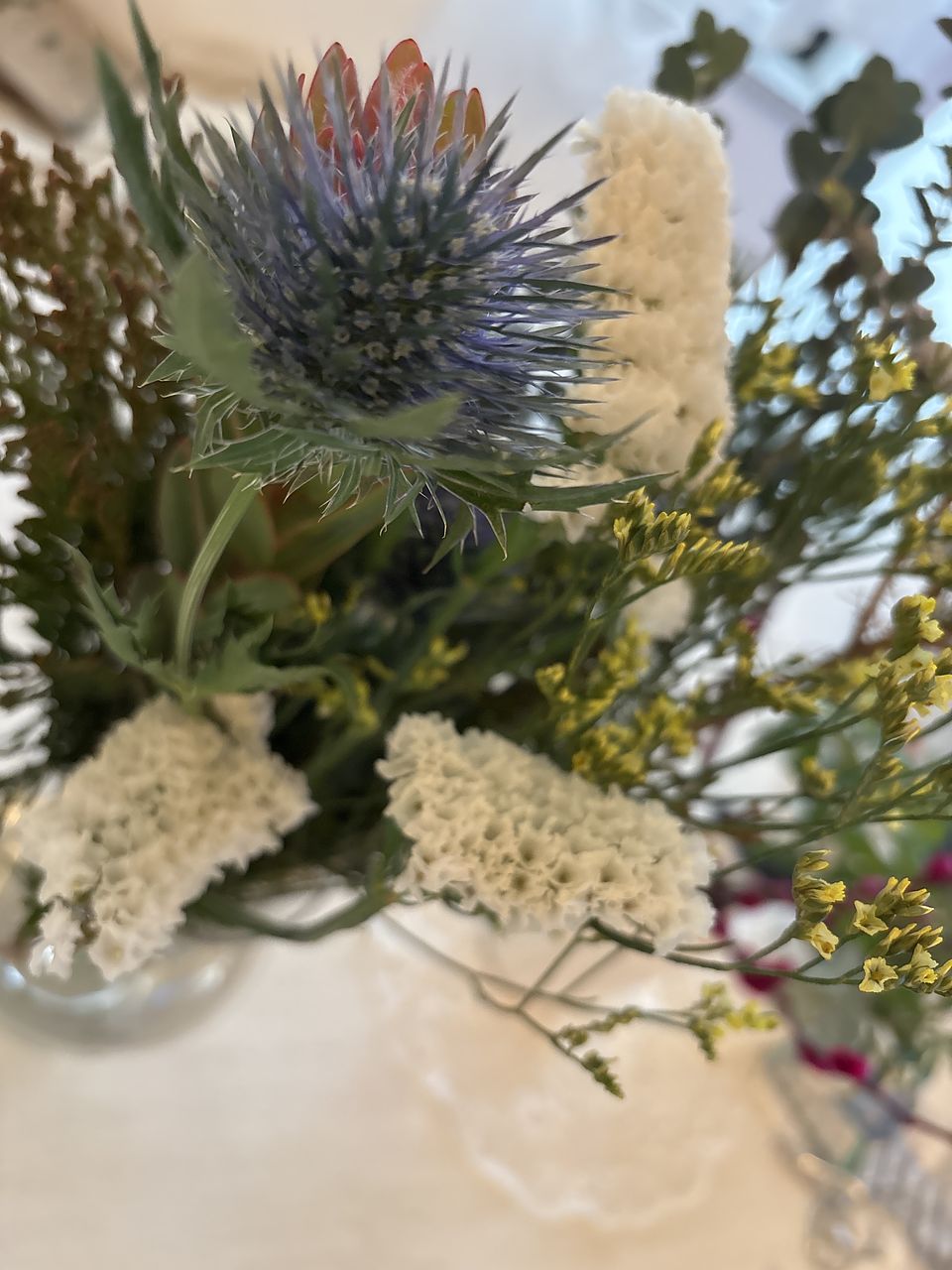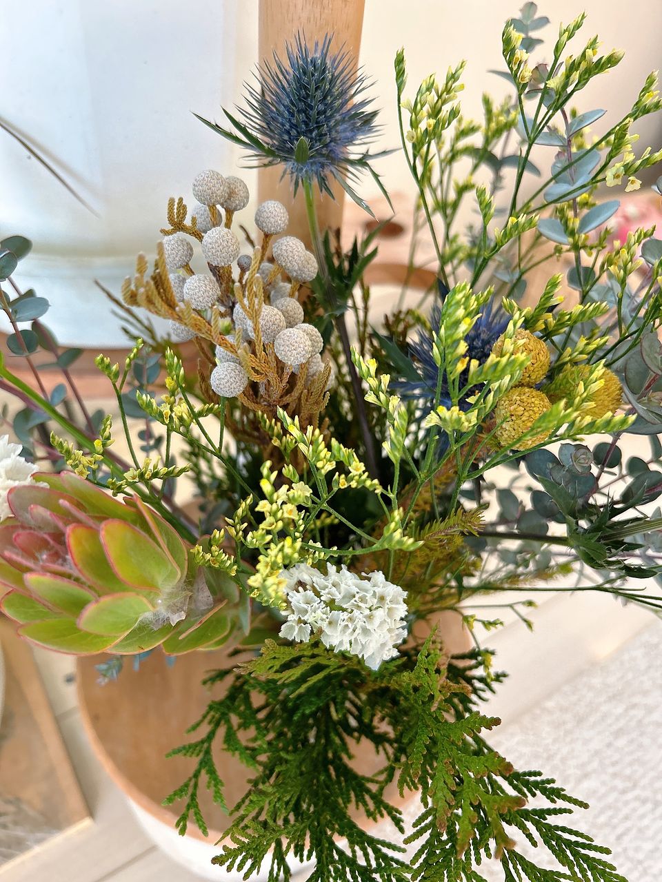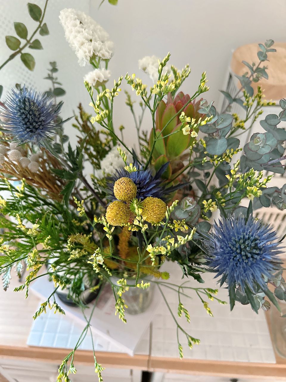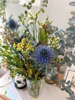 届いてすぐにスワッグに仕立てたのですが、エリンジウムのツボミがたくさん!開花の様子も見たくて全部花瓶に活けました。変化を楽しんでいきたいです。