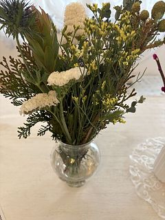 届いた時は白が多い印象でしたが、長さなど整えて花瓶に飾ると、ボリュームも全体の印象もイメージ通りの花束になりました!香りも良いです!わらびのようなクルクルした植物も入っていて、アクセントにかわいいです🩷少し飾ったらスワッグにしようと思います!