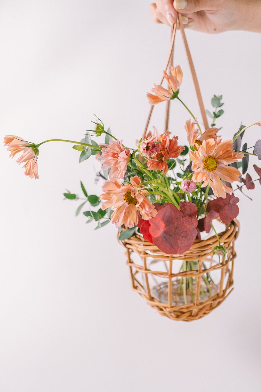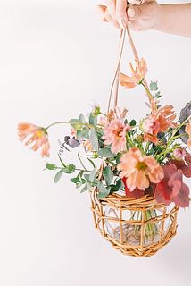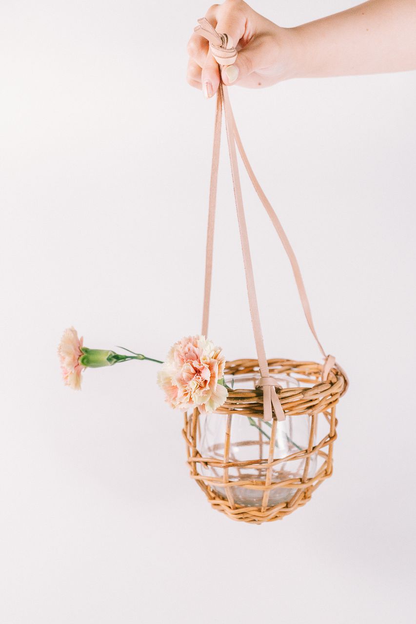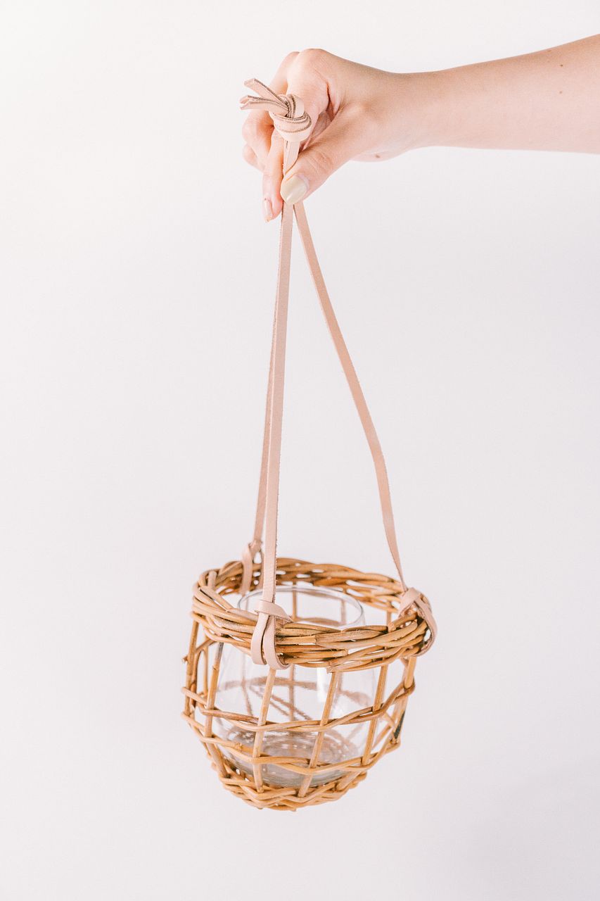 編み目の透かしから花やグリーンがのぞくデザインで、吊るすだけで軽やかな印象に。レザーの紐が全体をすっきりとまとめてくれます。