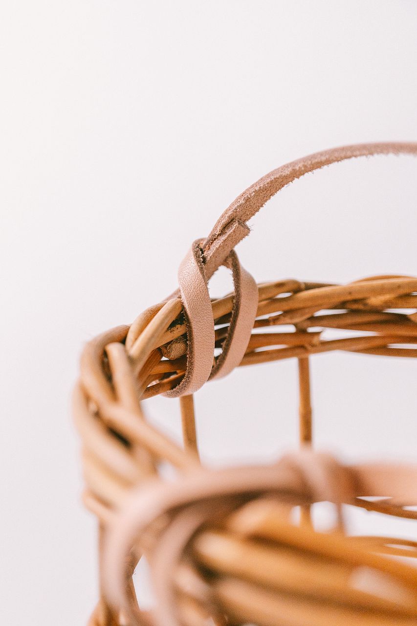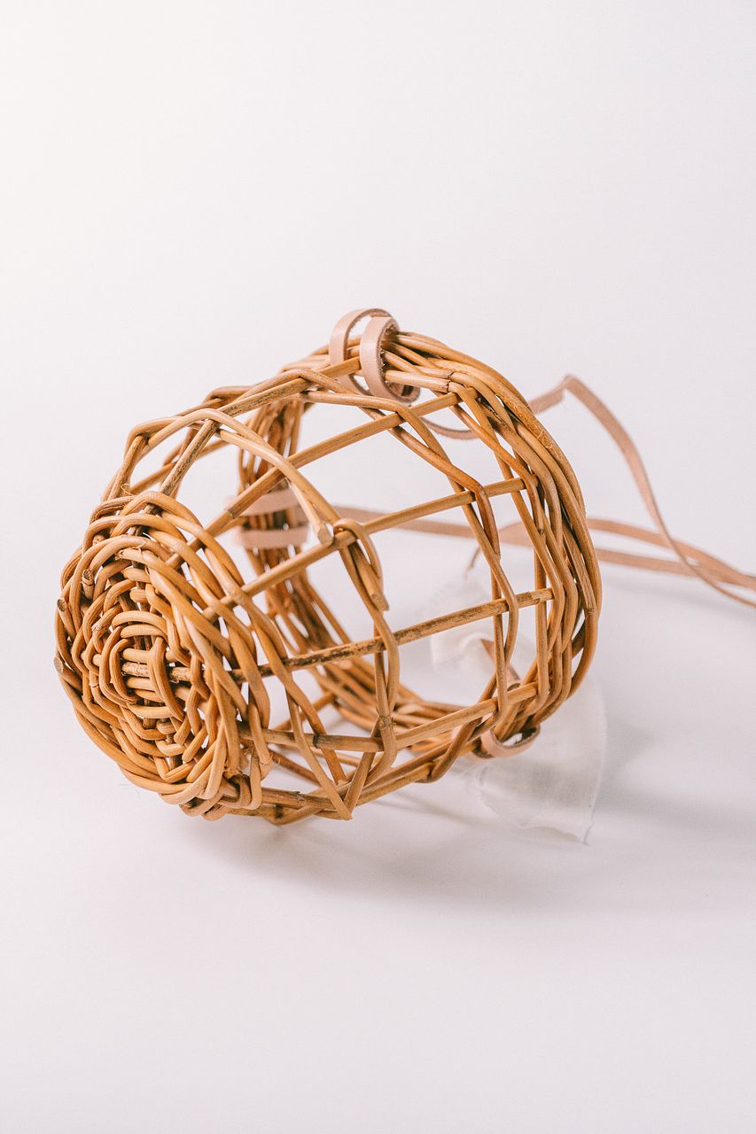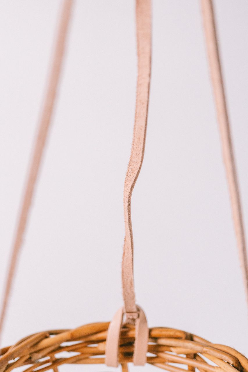編み目の透かしから花やグリーンがのぞくデザインで、吊るすだけで軽やかな印象に。レザーの紐が全体をすっきりとまとめてくれます。
