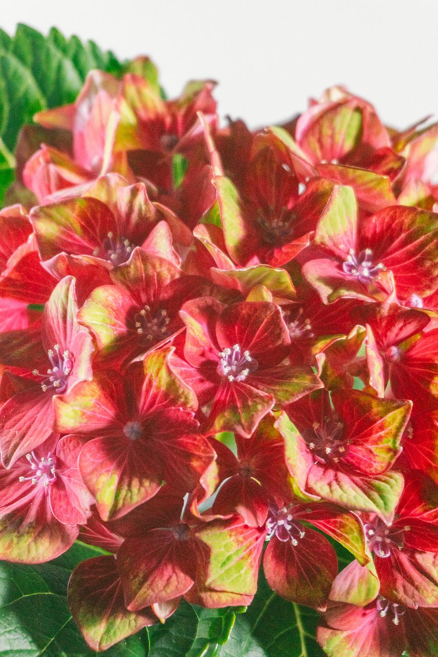 鮮やかな赤色に、グリーンが混ざり合う印象的な花色。