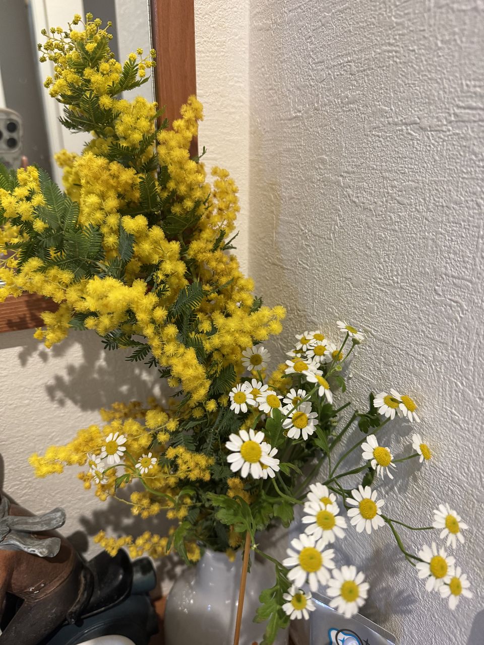 ふわふわのミモザと可愛らしいマトリカリアのセット。お部屋に春が来ました☺️ ミモザはスワッグにして楽しみたいと思います。
