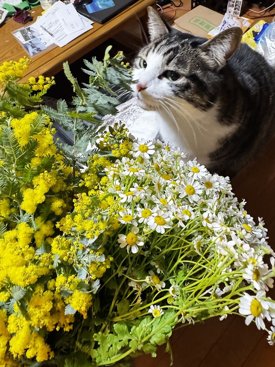 華やかなミモザとマトリカリアの可憐な花束 ボリュームたっぷりで我が家に春がやってきた感じです。るんるん気分で活けました。ありがとうございます。