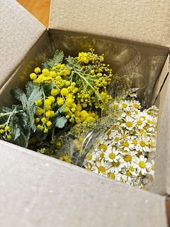 ボリュームたっぷりのミモザとマトリカリアが届きました。ミモザは枝部分が短いので花を取ることになり残念です。リースを作る用には適しているかもです。花もパラパラおちてもったいないかな。マトリカリアは北海道なので寒いのかちょっと元気ない感じですが春を感じられてお花から元気をもらいます!次回はどんなお花にしようかなぁ