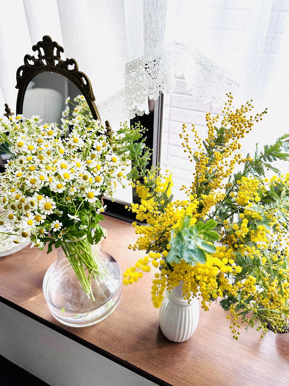 マトリカリアもミモザもとてもボリュームがあって花びん3つに生けることができました。春らしくとても気分が上がります♪