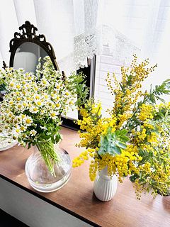 マトリカリアもミモザもとっても綺麗です。一つの花瓶では飾りきれなかったので2つに分けました。 いっぺんで春が来ました。 ありがとうございました♪