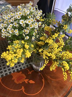 ボリューム満点のマトリカリアとミモザです。 ミモザの黄色は元気をもらえます。 マトリカリアの水揚げが難しいかも。 リースにしたくて購入しました。 8日のミモザの日まできれいな黄色で いてくれたらいいな