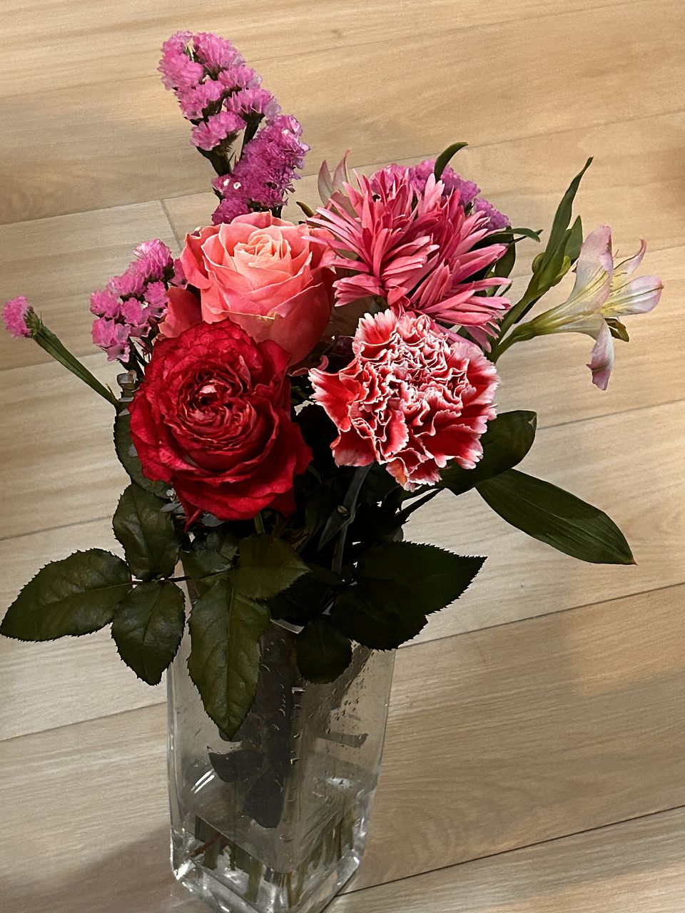ピンク色のお花が沢山入っていて、我が家に春がやって来たような華やかなブーケでした。 玄関に生けたら、バラのいい香りがして癒されます。