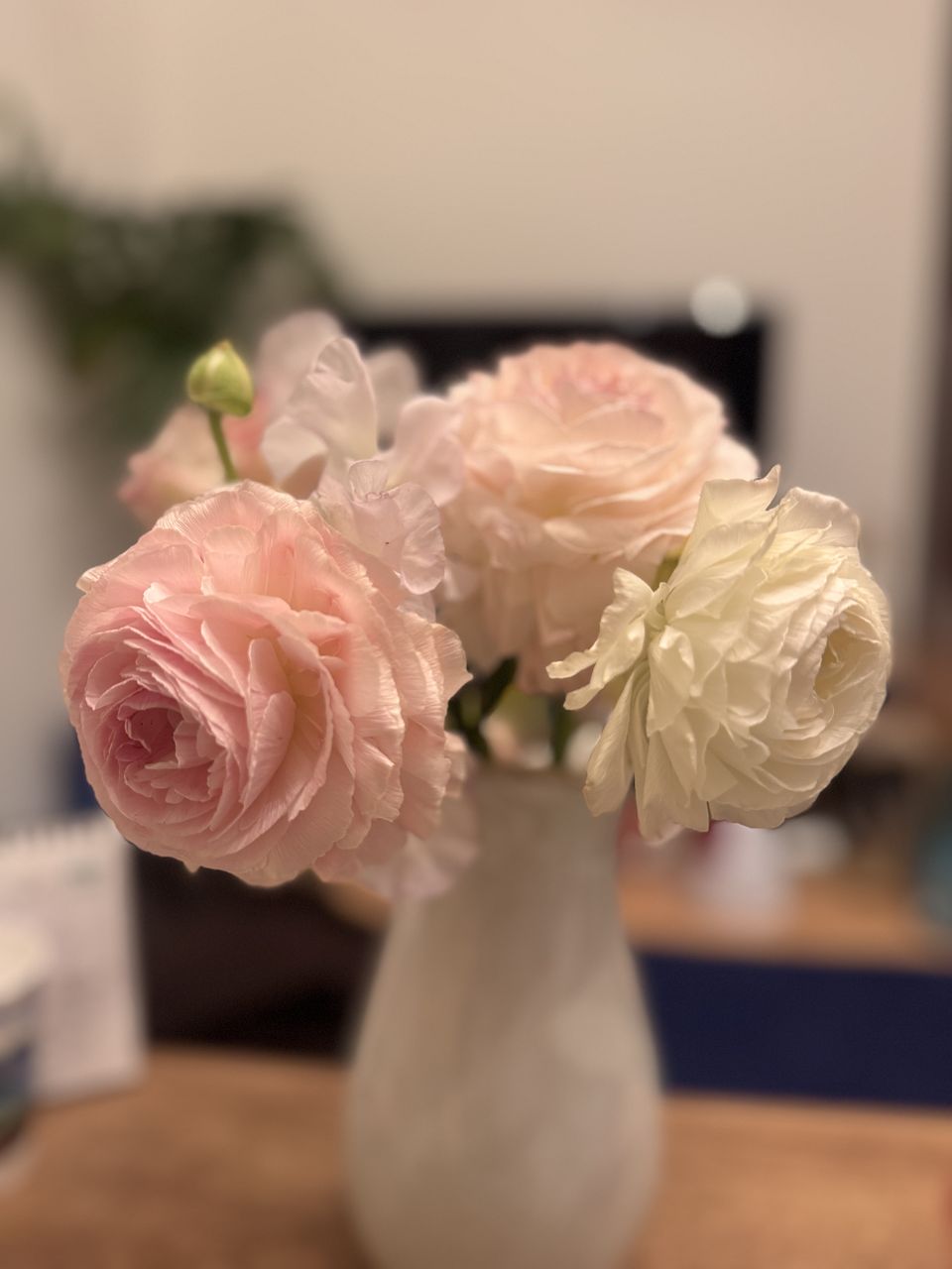 スイートピーが7本、ラナンキュラスが6本でした。ピンク色がかわいくて、お部屋が一気に春になりました。