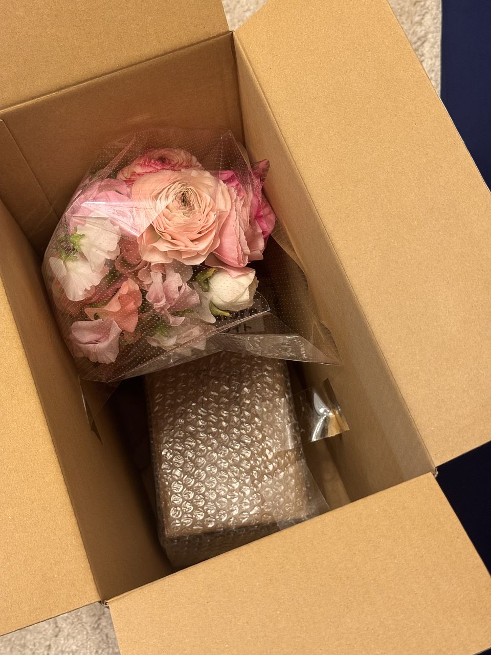 箱を開けた瞬間に、優し香りがし、春色の柔らかなお花たちが微笑んでいました。 今日は、曇りでどんよりな我が家の玄関が、明るくなりました。