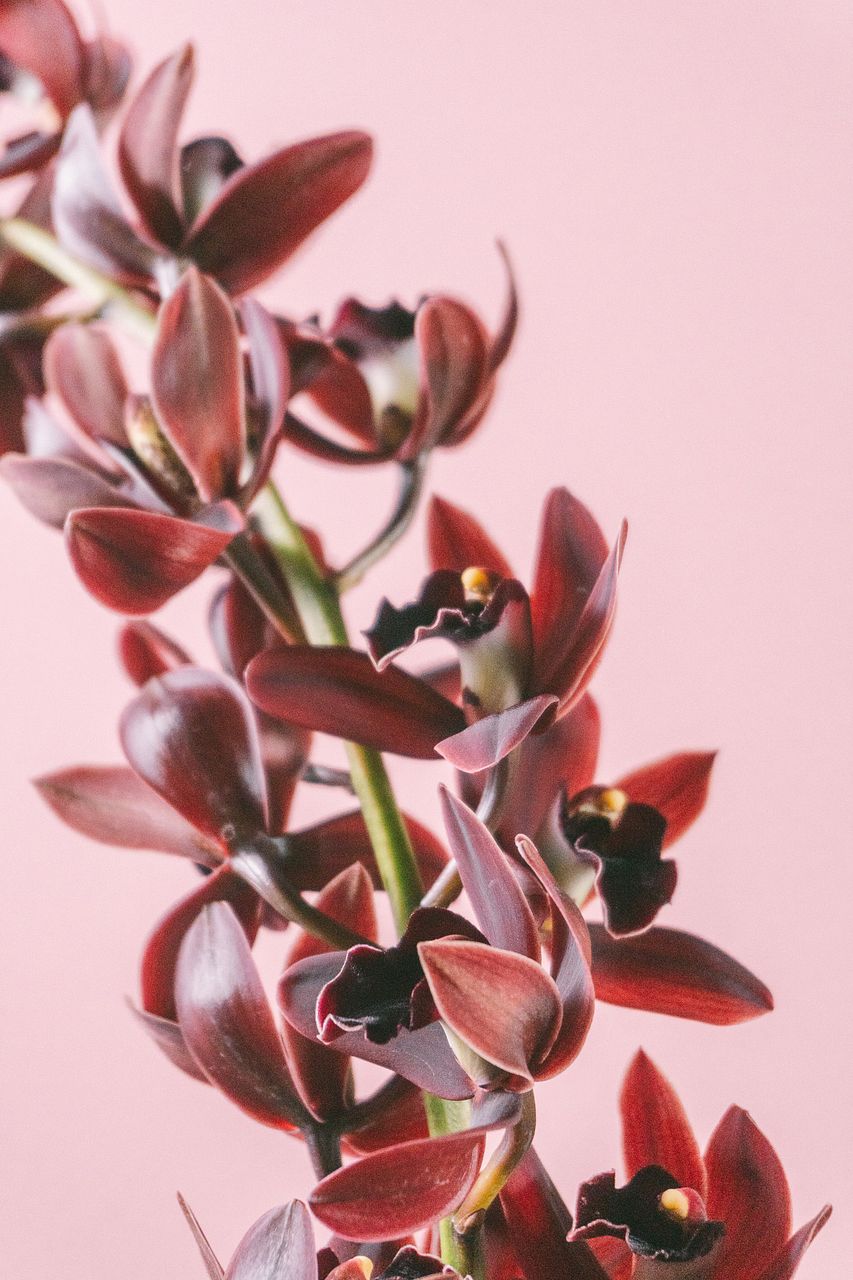 黒に近い深みのある赤〜紫の花を咲かせる、魅惑的でスタイリッシュな洋ランです。