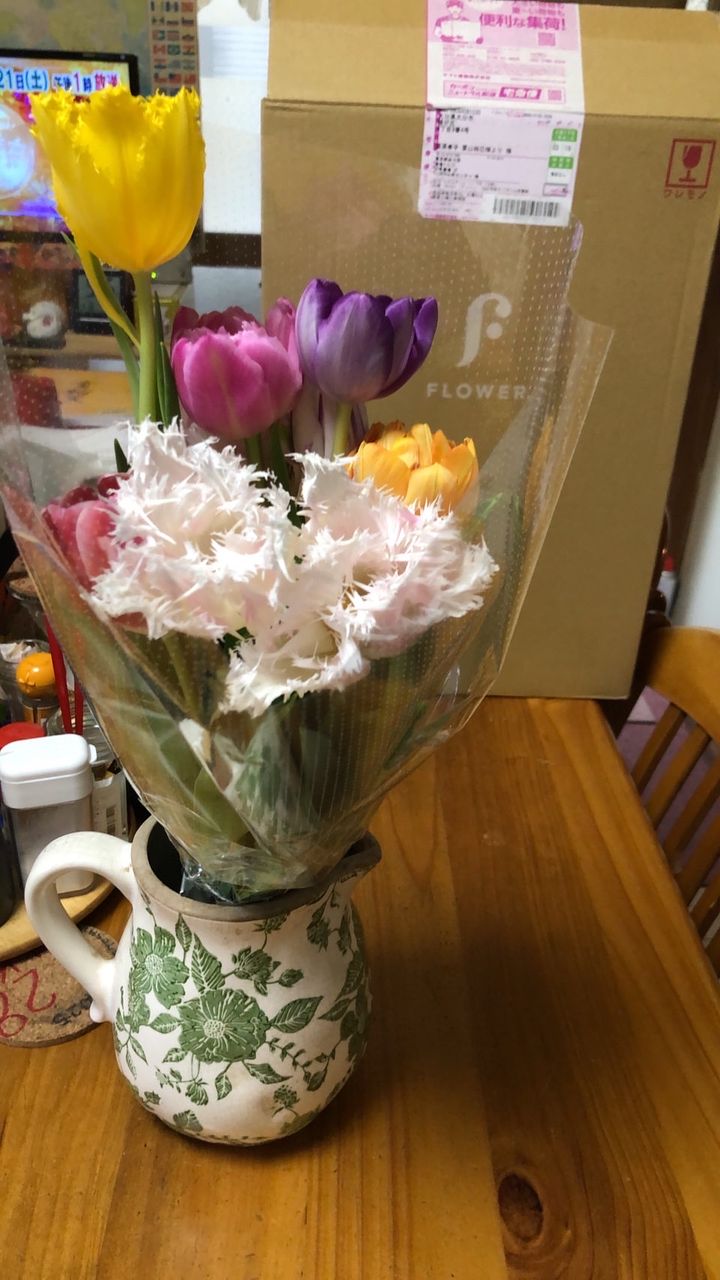 早くもお花の世界では春が訪れました🌷ショートサイズのチューリップだけを束ねて。