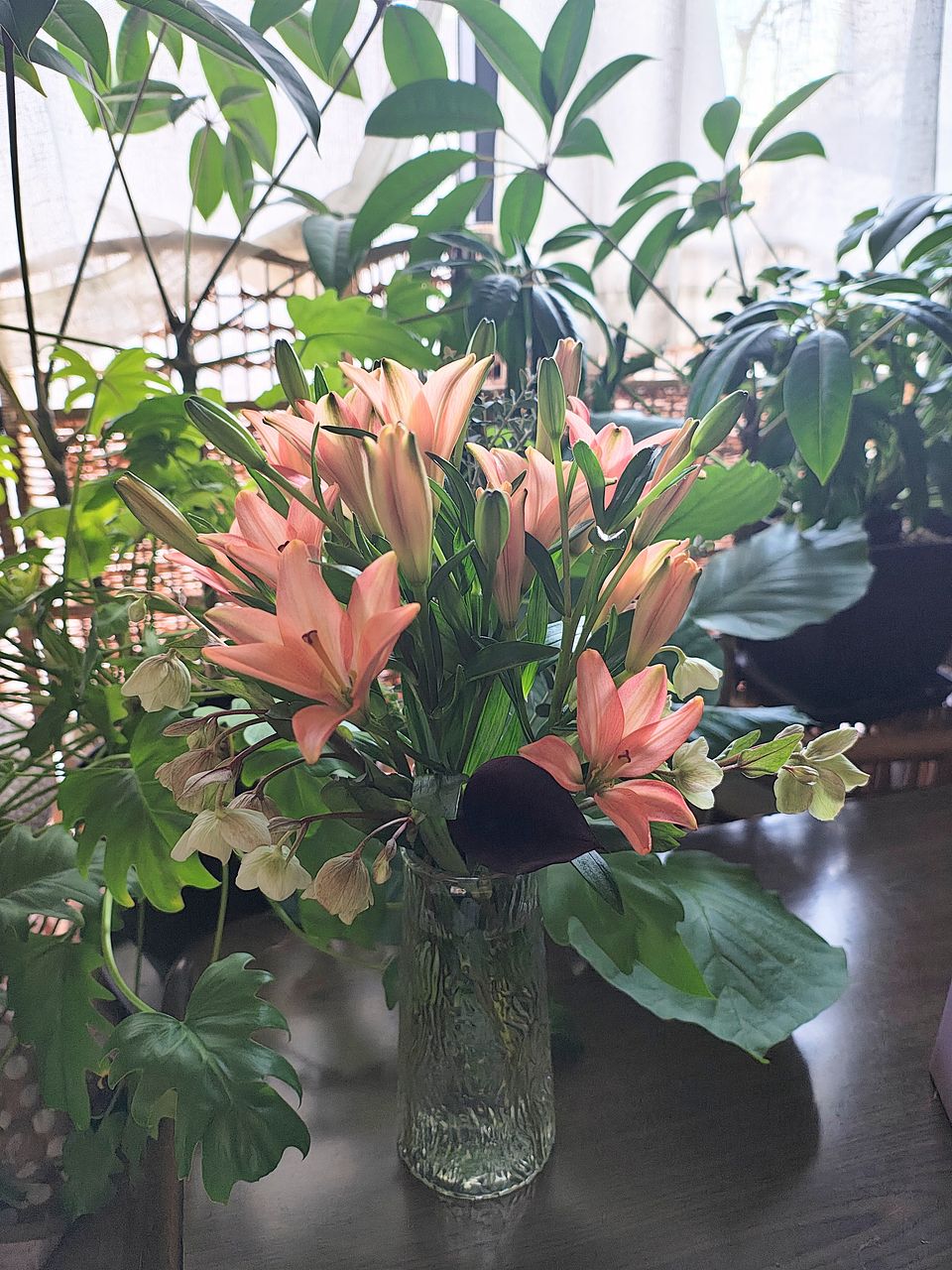 届いた時は全て蕾でしたが、翌日から少しずつ咲き始めました。写真は4日目です。前回に 注文したクリスマスローズとカラーが元気だったので一緒に飾ってみました。薄いオレンジ色が落ち着く色あいなので、とても気に入っています。