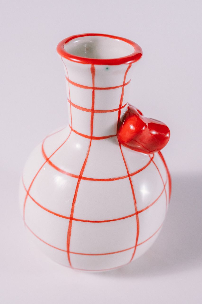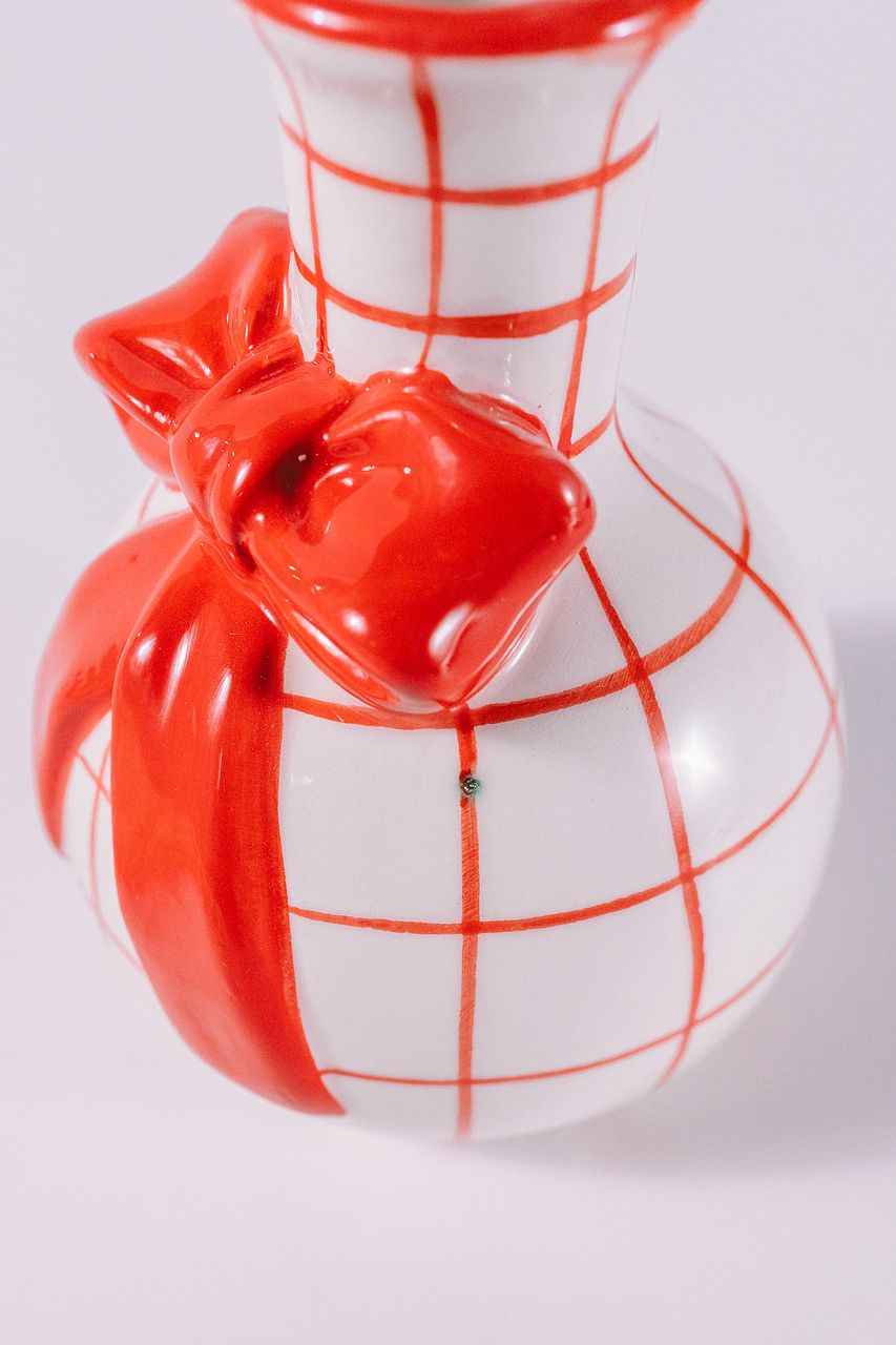 赤いリボンにチェック柄😍遊び心たっぷりの「Ribbon Checkered Vase」。立体的なリボンがアクセントになり、置くだけで空間を明るくしてくれます。