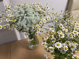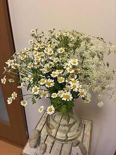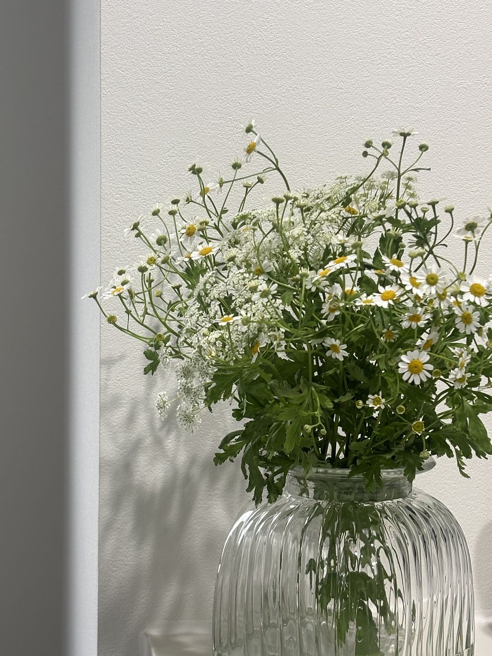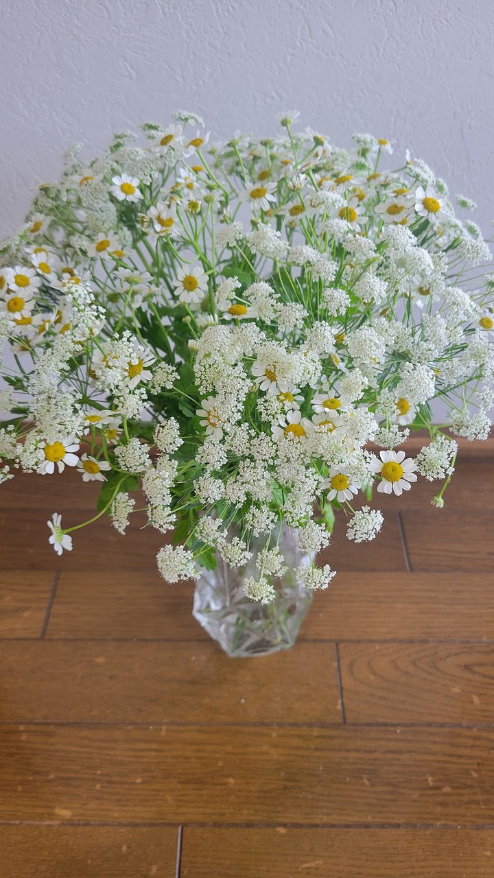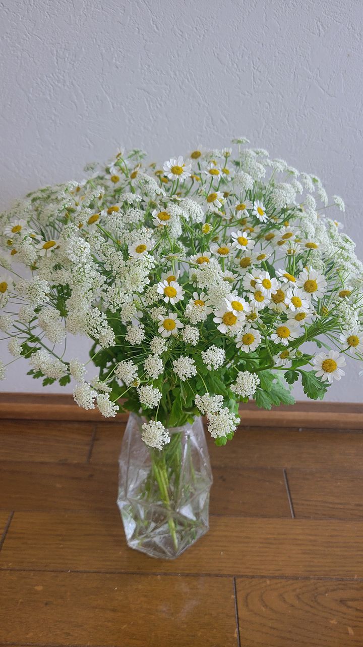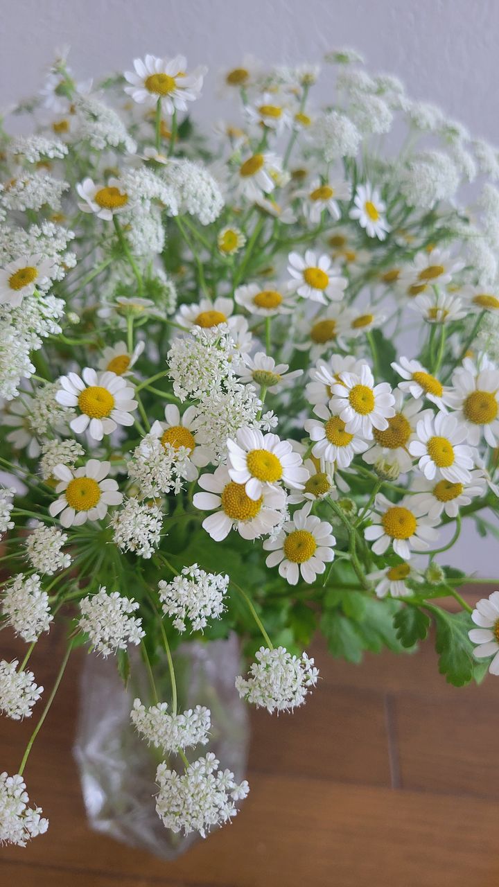 繊細なレースフラワーと小花が可愛いマトリカリア。一緒に併せると本当にこんもり❣️ 別々に束ねられて届くので それぞれ丁寧にほどいて葉を取り除きました。カワイイ〜😍 マトリカリアはそっとほどかないと折れてしまうので時間を作って処理し水揚げします。 折れてしまってもたっぷりあるので安心です😊 テーブルの上に小さな草原ができました♡ 眺めていると心が洗われます🥹 折れたものは小さい花瓶に飾ると これまた可愛くてどんなお花と併せても合う万能なお花で注文して良かったと思いました♪
