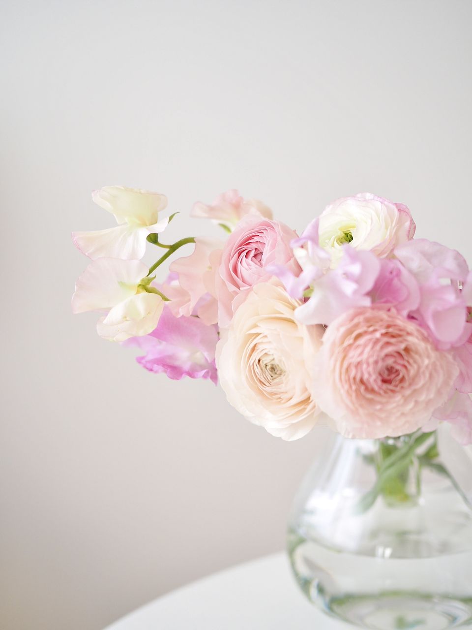 スイートピーの軽やかな花びらと、ラナンキュラスの幾重にも重なる花姿を束ねた、やさしいピンク色のブーケ🌸