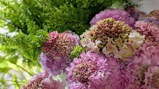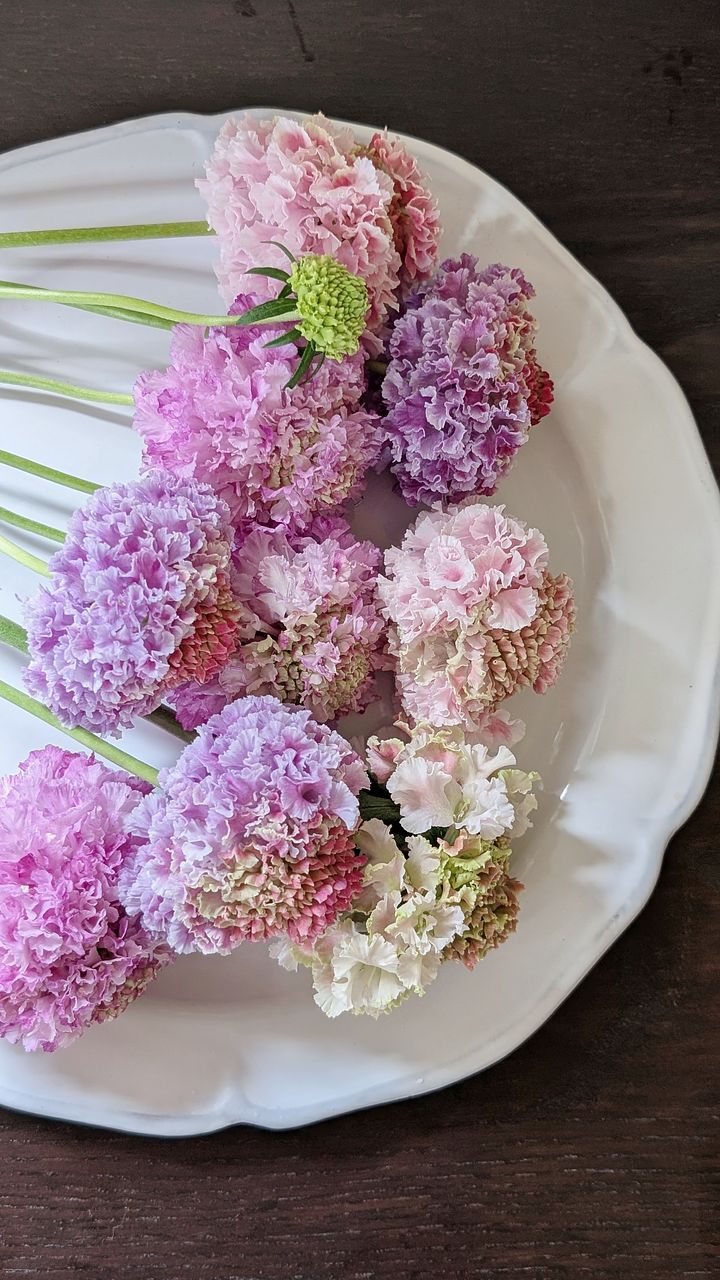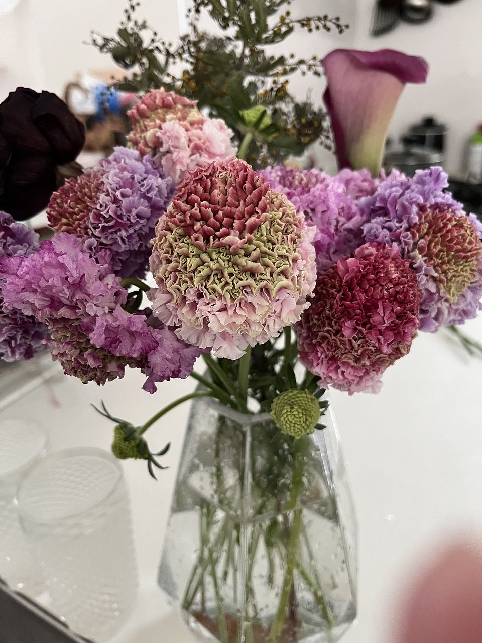 ピンク~パープルのグラデーションがかわいいです。合計9本と小さな蕾が1本入っていました。ボリュームは少なめなので2倍量たっぷりあったらもっとかわいいと思います。写真は花瓶に入れたら隙間が出来るので、別のアレンジメントで使ったグリーンを足しました。 長持ちしてくれるといいな。スカビオサ初めて知ったお花です。これからどんな表情を見せてくれるのか楽しみです。 それからお花の生産者さんの愛情を感じます。私も大切にお世話したいと思います☺️💕