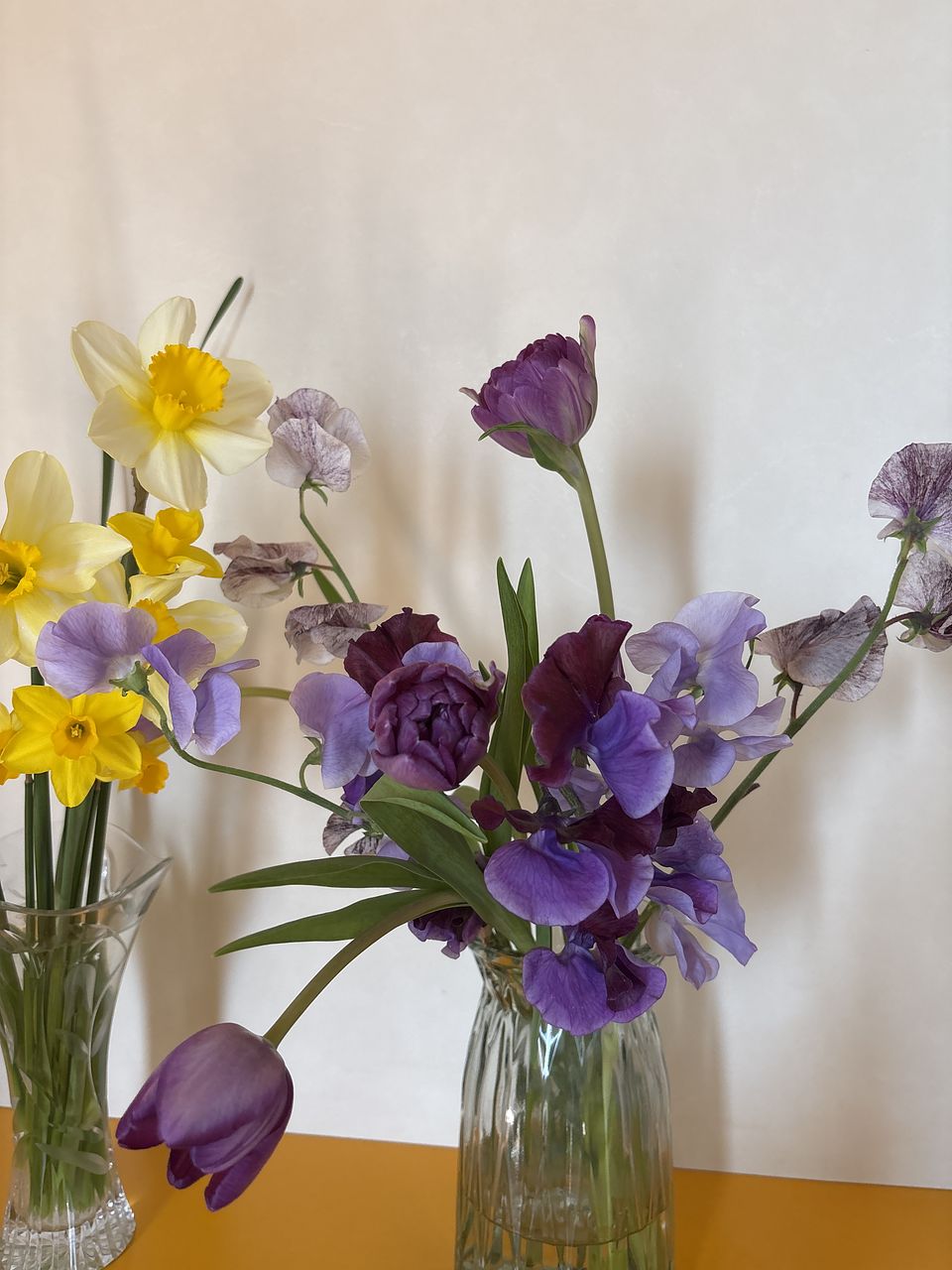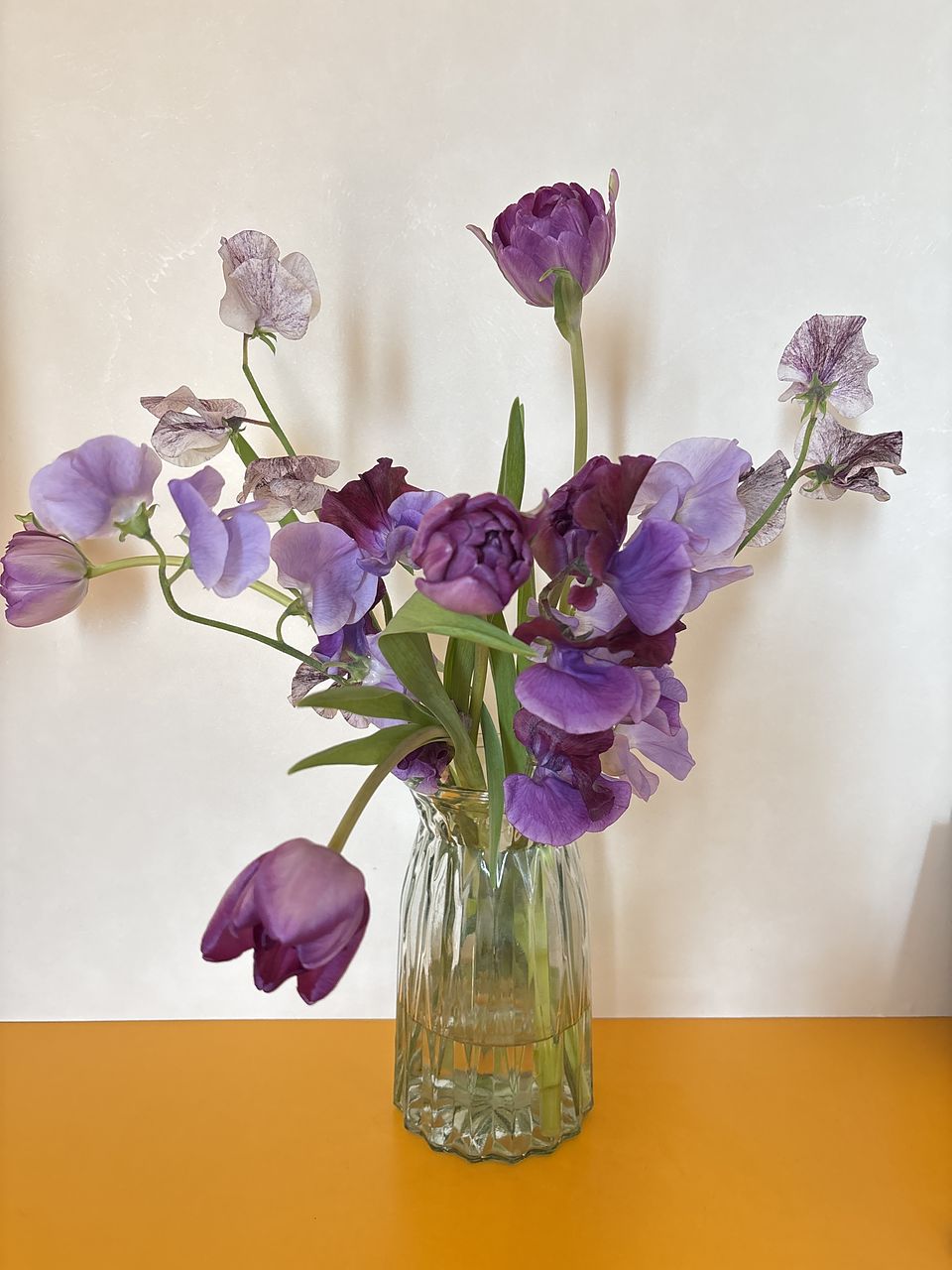 2度目の購入です。スイトピーの良い香りと小ぶりなパープルのチューリップがかわいいです。今回はさらに濃紫のスイトピーも一緒に生けて華やかです。