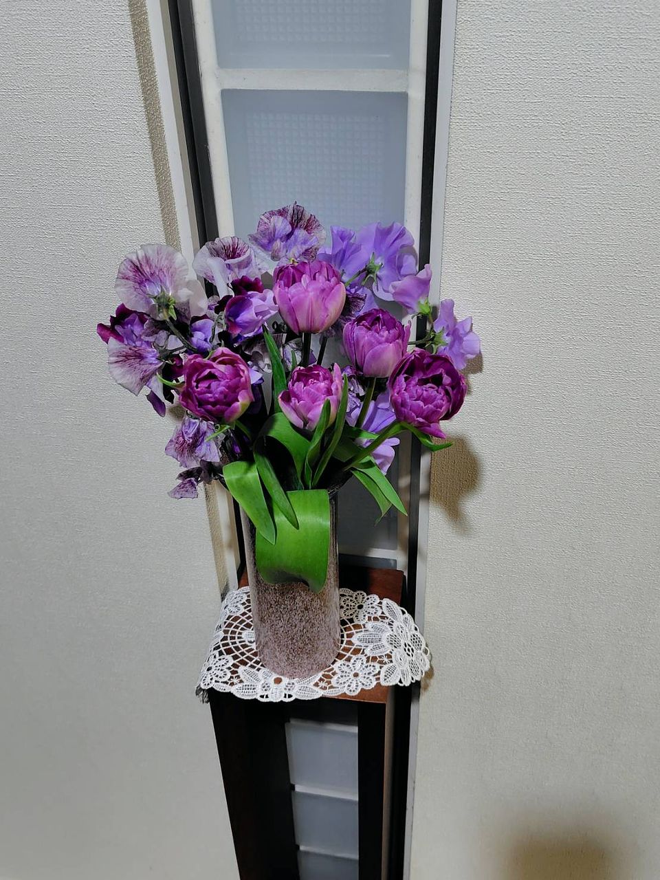 母の卒寿のお祝いにと、紫のお花、購入しました。スイートピーも紫だけど色々でとっても綺麗でした。チューリップが咲いてくるのが、楽しみです。