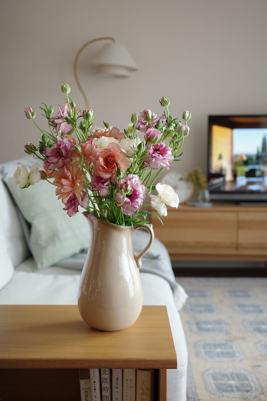 配送の箱を開けると、ぎっしりとお花が入っていました。 取り出して、そのボリュームにびっくり。色合いも柔らかく素敵で、無造作に花瓶に生けただけで、リビングがとっても華やかになりました。