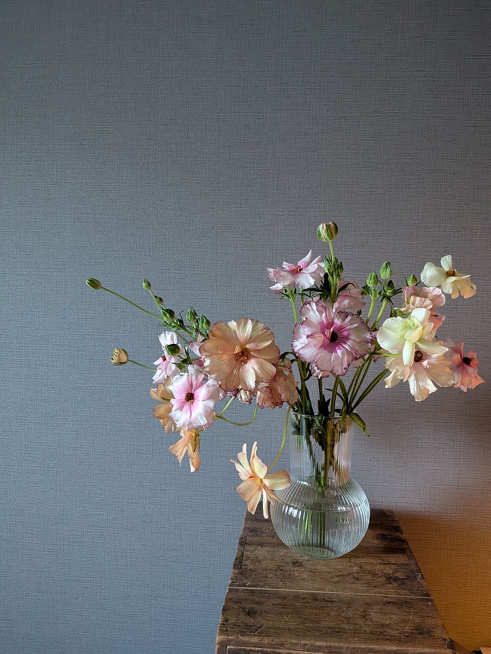 到着した時は、花びらが咲ききって、細い茎も垂れている印象でしたが、花瓶に入れた翌日には、全て光に向かって上を向き、元気いっぱいになりました。お花もふんわりと膨らんで、日に日にふわふわとして、さらにボリュームいっぱいになっています。固かった蕾も咲いてきて、毎朝表情が変わるので、まだまだ楽しめそうです。