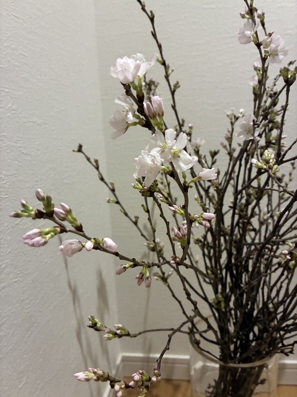 蕾が沢山ついた彼岸桜が届きました。少しずつ開花していくのが楽しみです☺️写真は飾って3日目の状態。可愛い花が沢山咲き始め、入居者さんやお客さまを優しくお出迎えしてくれています。