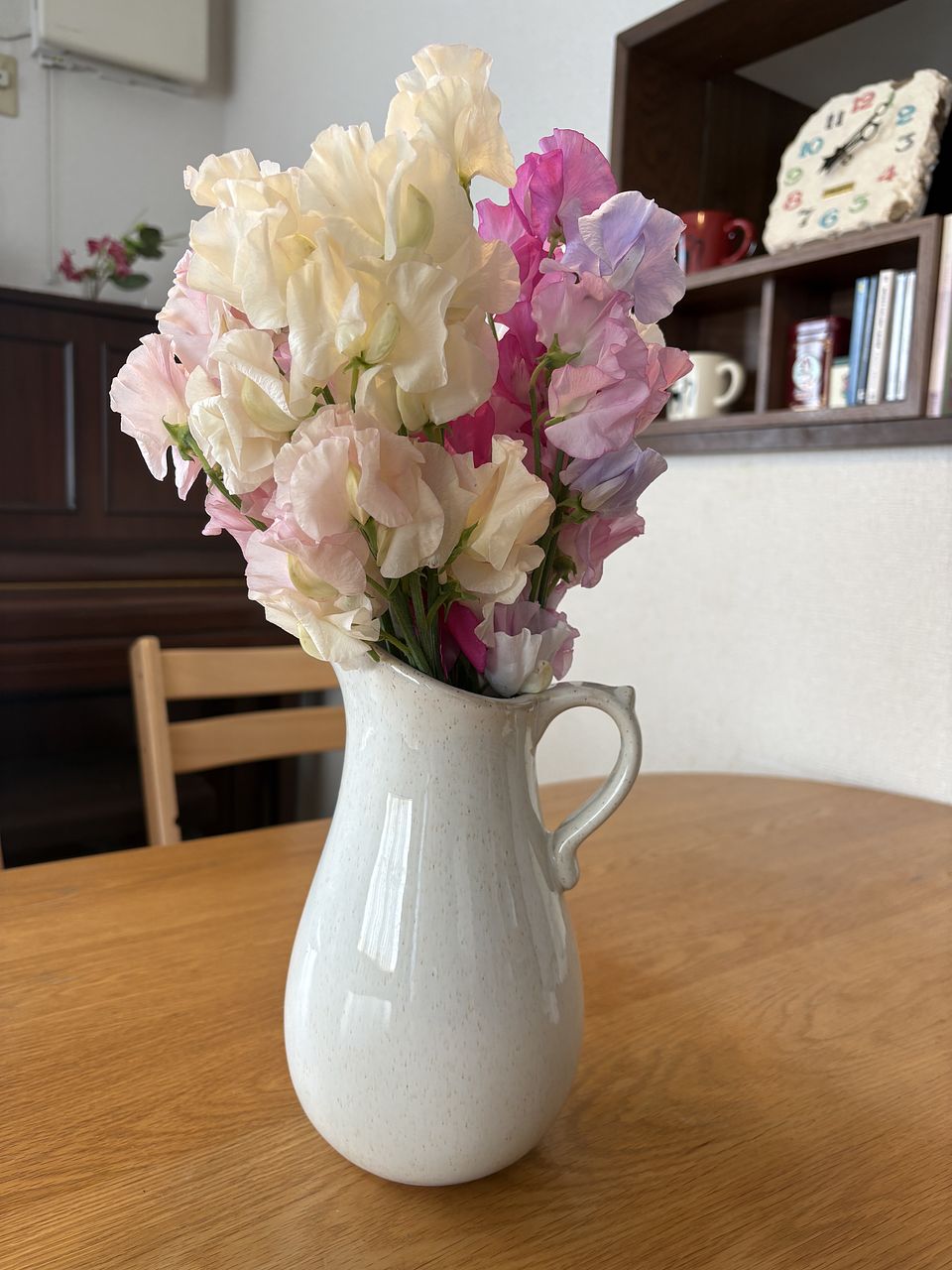 パステルカラー中心に沢山のスイトピーが届きました。玄関が明るく華やかになりとても嬉しい❣️ もりもりスイトピーが届いて10日あまり、 まだまだ元気に咲いています。 頑張って‼️