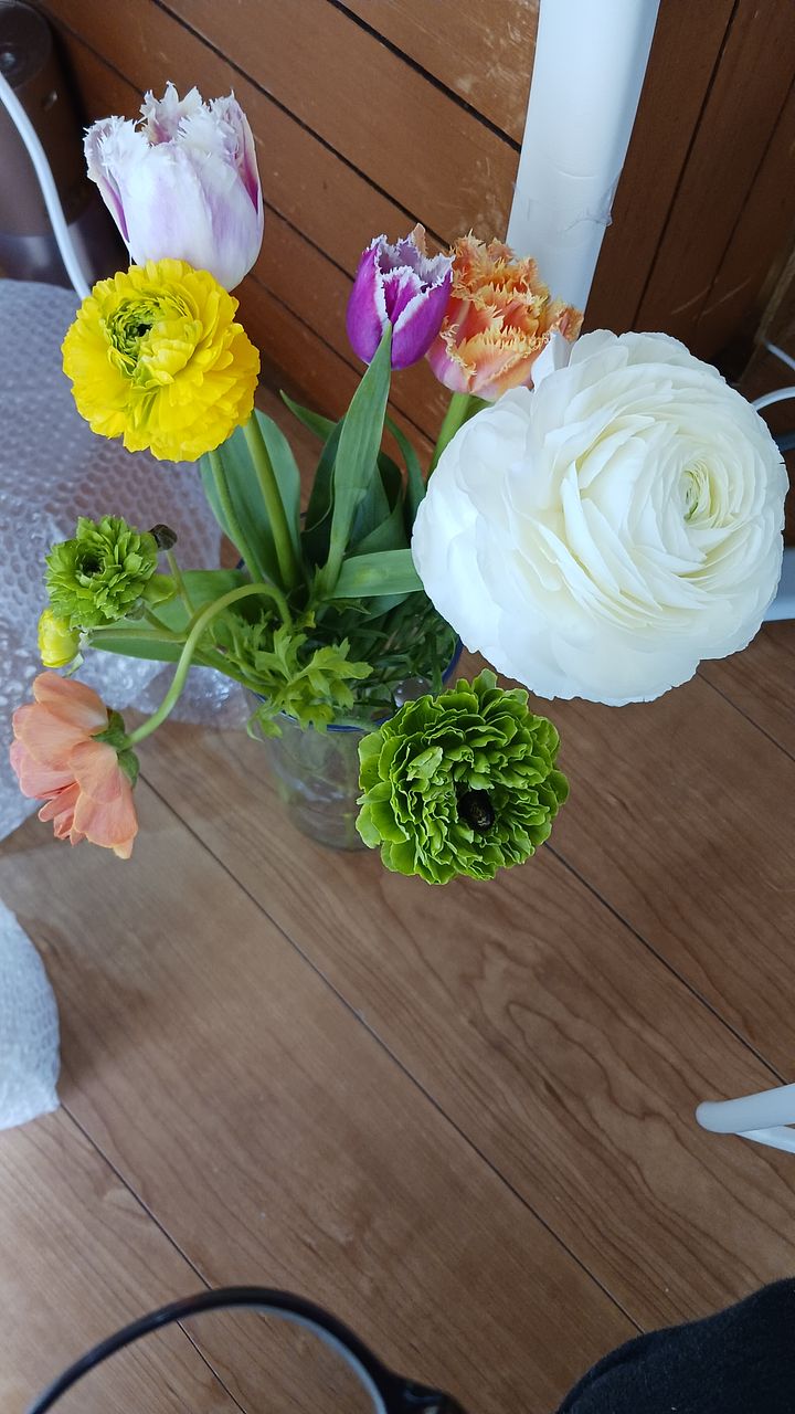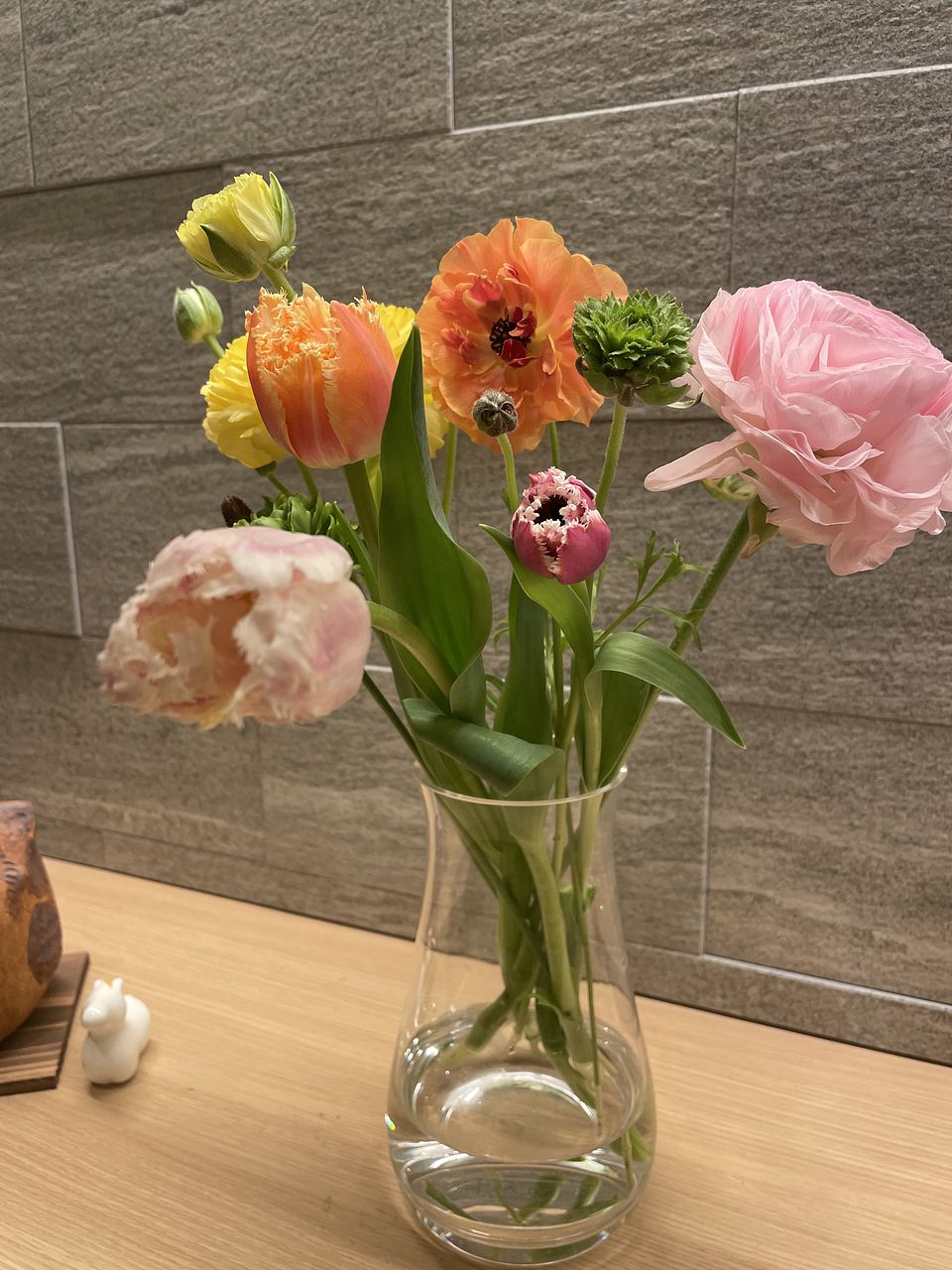大好きなラナンキュラスとチューリップ、それぞれの種類、色の組み合わせがオシャレでテンション上がりました。