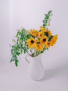 まっすぐに咲くひまわりの力強さと、軽やかに広がる小手毬の枝が、空間にやさしい光を運びます。
