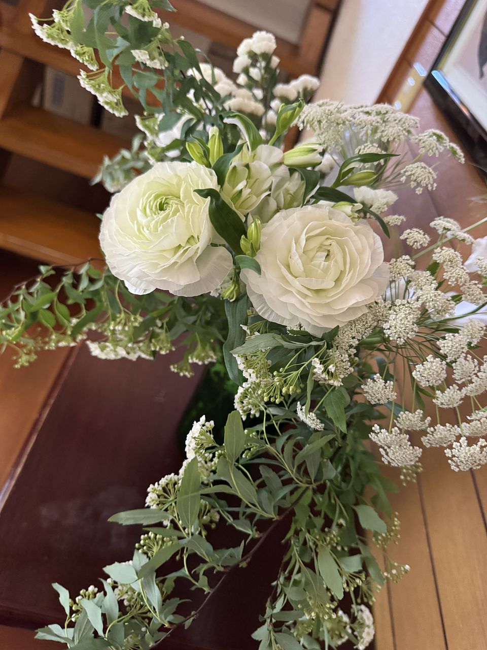 思っていたよりお花は少なく感じました。 家にある白の花を追加して飾っています。 でも、グリーンと白は清々しくきれいです。