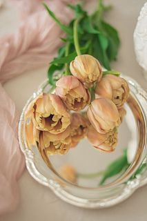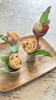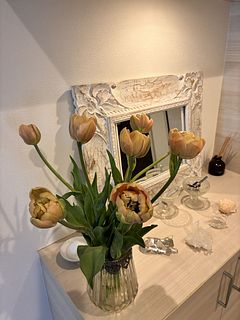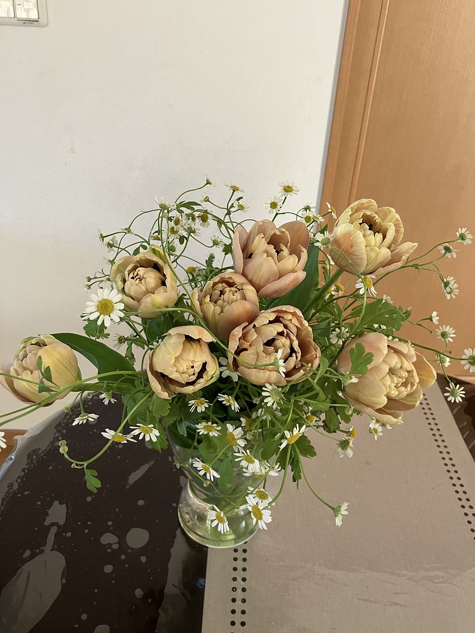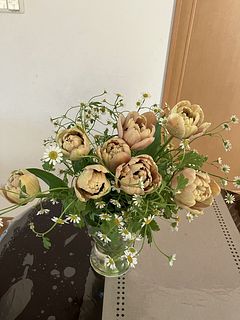 アンティークな色のチューリップ。初めて購入しました。マトリカリアと一緒に春らしく。暖かいので、水揚げしているうちに開いてきました。可愛らしいチューリップです。