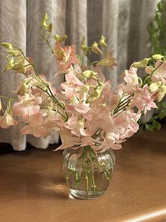 ピーチピンクでしっかりしたデンファレが届きました。ふんわりと優しい雰囲気です。 下についていた花は摘んでお花だけ生けました。 蕾が沢山ついているので咲くのが楽しみです。