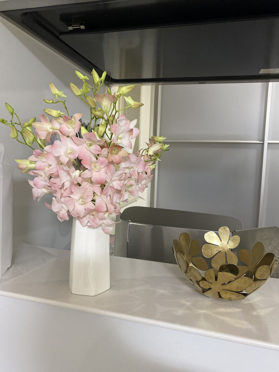 かわいい色味のデンファレで部屋が華やぎました ウェーブの花瓶も素敵ですね お花見気分で一杯やりました〜