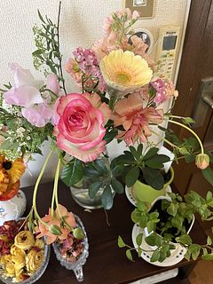 色々トラブルがあって記念日当日到着のは選べなくなってしまったので、先に自分で花屋さんで買った物とmixして飾りました。自分で買ったものがローズピンク系と薄いサーモンピンクのmixなので、混ぜて飾ってみたら春らしい可愛いピンクのグラデーションができて良かったです