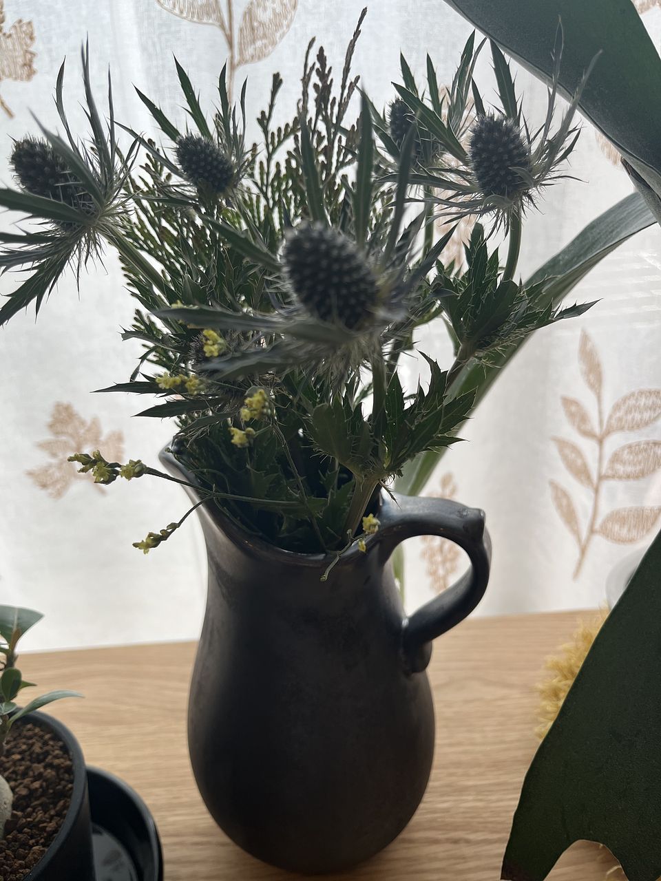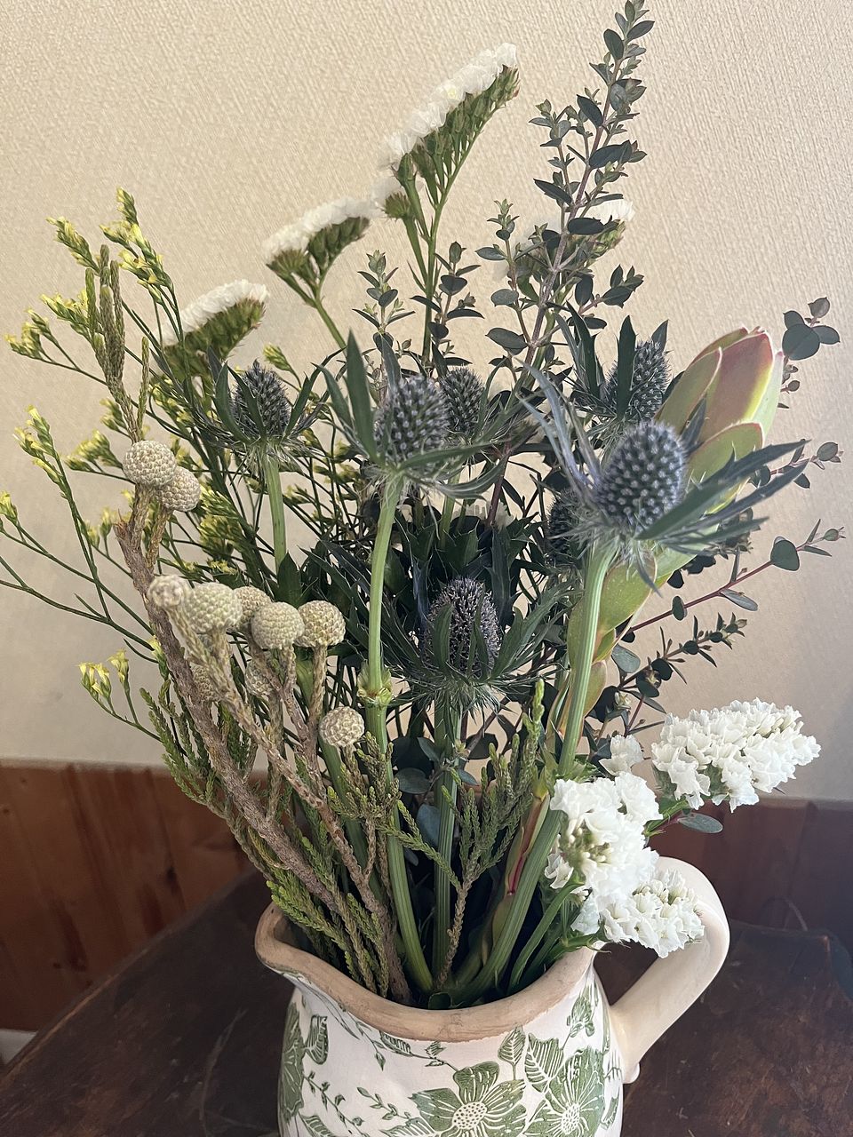 ヒバなど深い森の香りが楽しめるグリーンと、エリンジウムなど涼しげな花を合わせました。