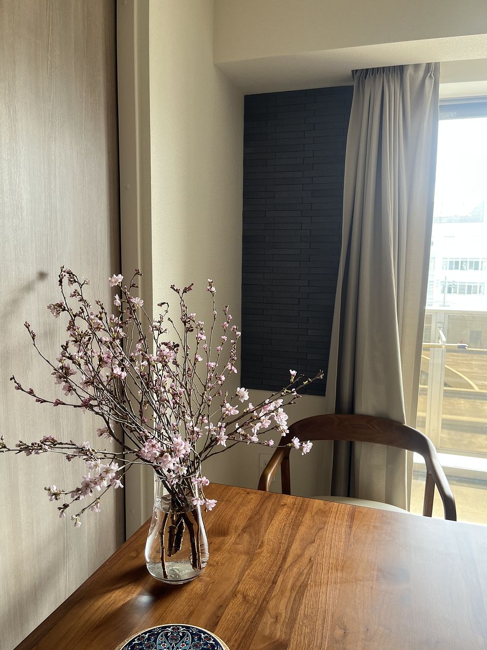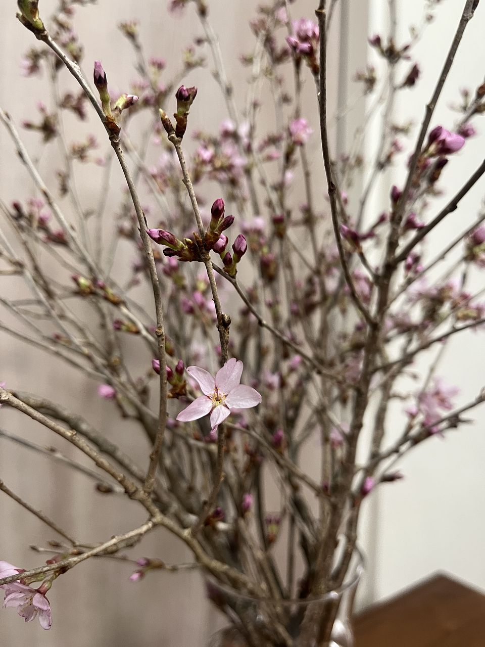 蕾だけの枝で届いて心配したけど、3日目には8分咲きに!リビングでお花見🌸できます。ほぼ白に近いから、濃いピンクのお花と一緒に飾っても素敵でしょうね。