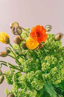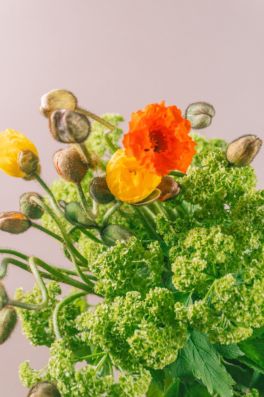 風にそよぐポピーの可憐さと、もこもことしたスノーボールの愛らしい丸みが重なり合うブーケ。思わず触れたくなるようなやわらかさが、心までほどいてくれます。