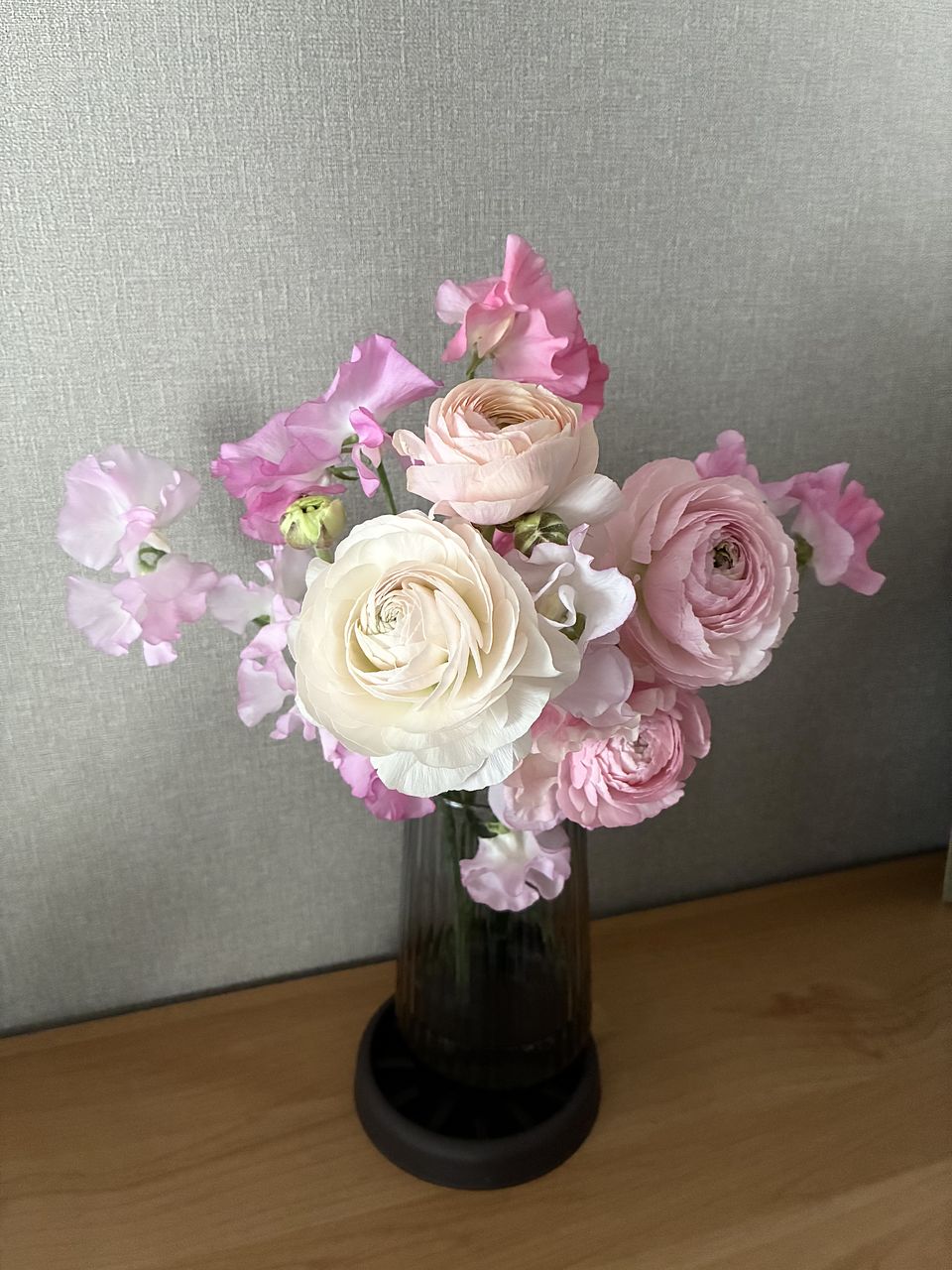 スイートピーの軽やかな花びらと、ラナンキュラスの幾重にも重なる花姿を束ねた、やさしいピンク色のブーケ🌸