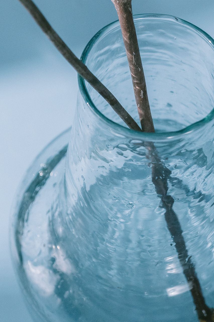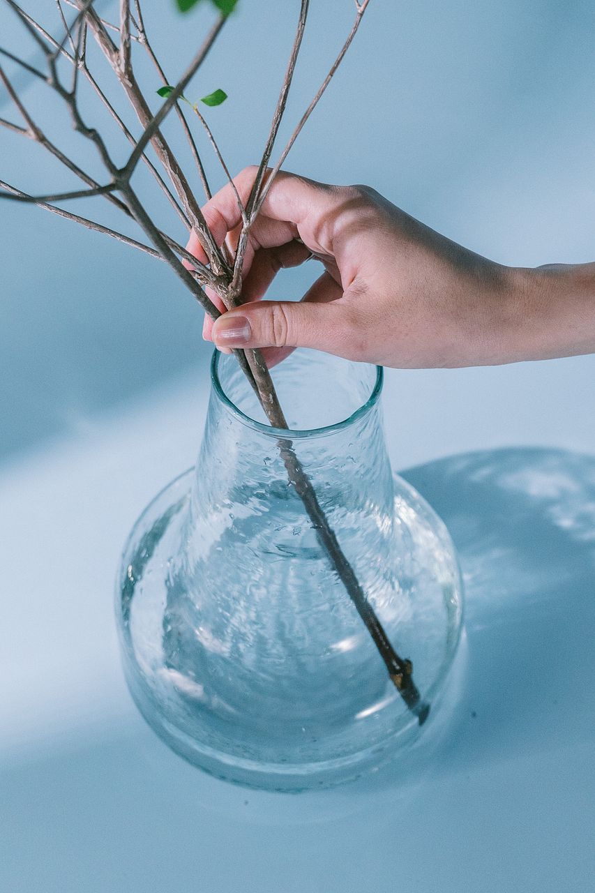 長い枝ものも美しく飾ることができる「シナリーベース アゼリア」。表面に施されたやわらかな凹凸ガラスが光を受けてきらめき、水の揺らぎまで美いフラワーベース。