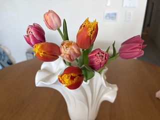 珍しいチューリップも入っており、とても可愛いかったです。数日で茎が曲がってきてしまいましたが、輪ゴムで結んで飾ることでいい感じになりました。