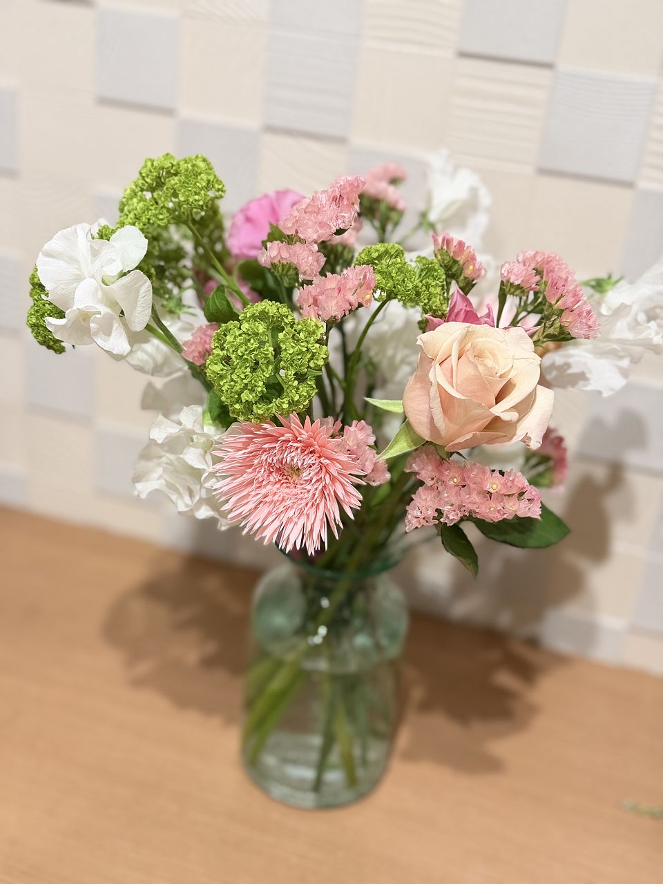 淡いピンクとグリーンの春らしいブーケが届きました!13本入っていてとてもお得だと思います。今度はカラフルなお花や、あまりお店では見かけないようなものを頼んでみたいなと思います!