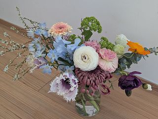 バラのいい香りと春色の花束が素敵でした オレンジ色のラナンキュラスかなと思われる花が一本花びらが散ってしまってましたが。