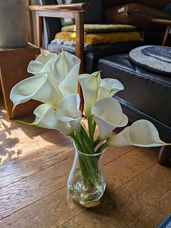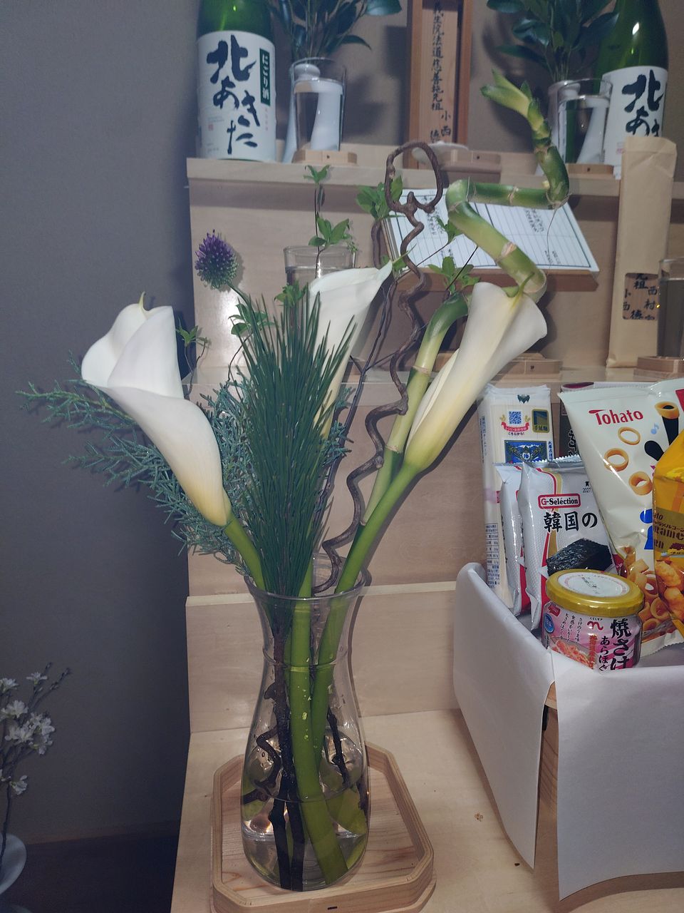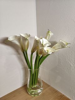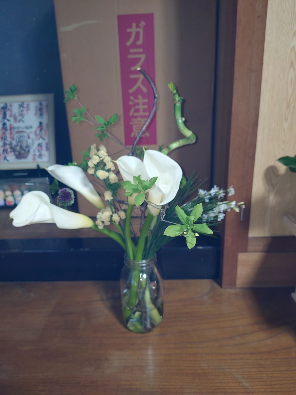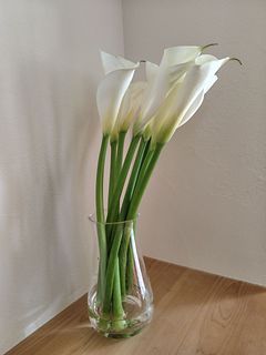 今回のカラーは、茎が太くて、しっかりしてました。 届くまで心配😟でしたが、永く楽しめたら嬉しいです。 ミリオンバンブーのクネクネブーケと、一緒に置きました。